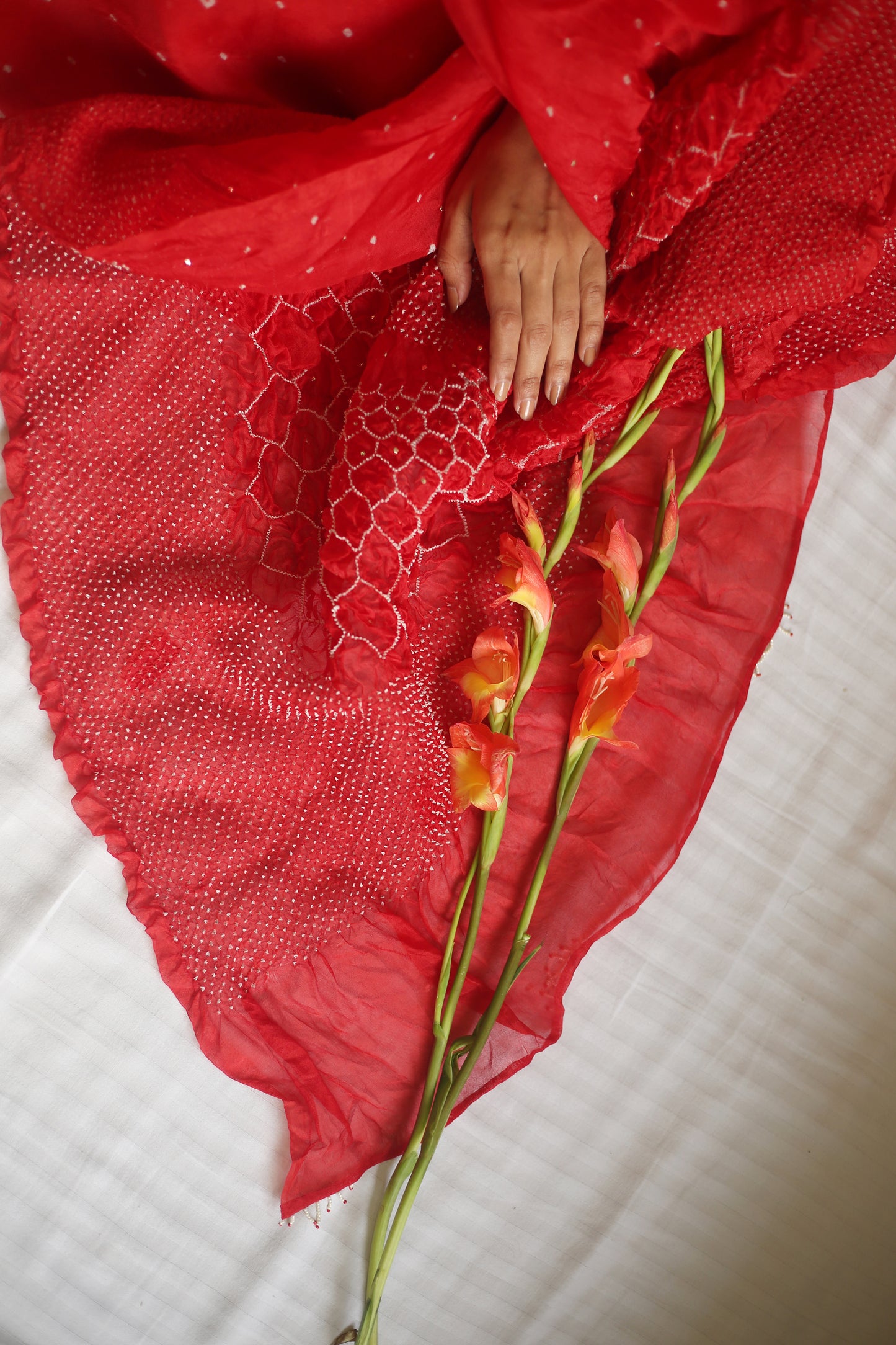 Refreshing and Bright - this Bandhani on Pure Organza Saree with Pattern on Pallu can be worn from Morning to Evening. Looks gorgeous when paired with pearl accessories. The saree comes with a red pure silk blouse piece. The blouse as in the image is suggestive.