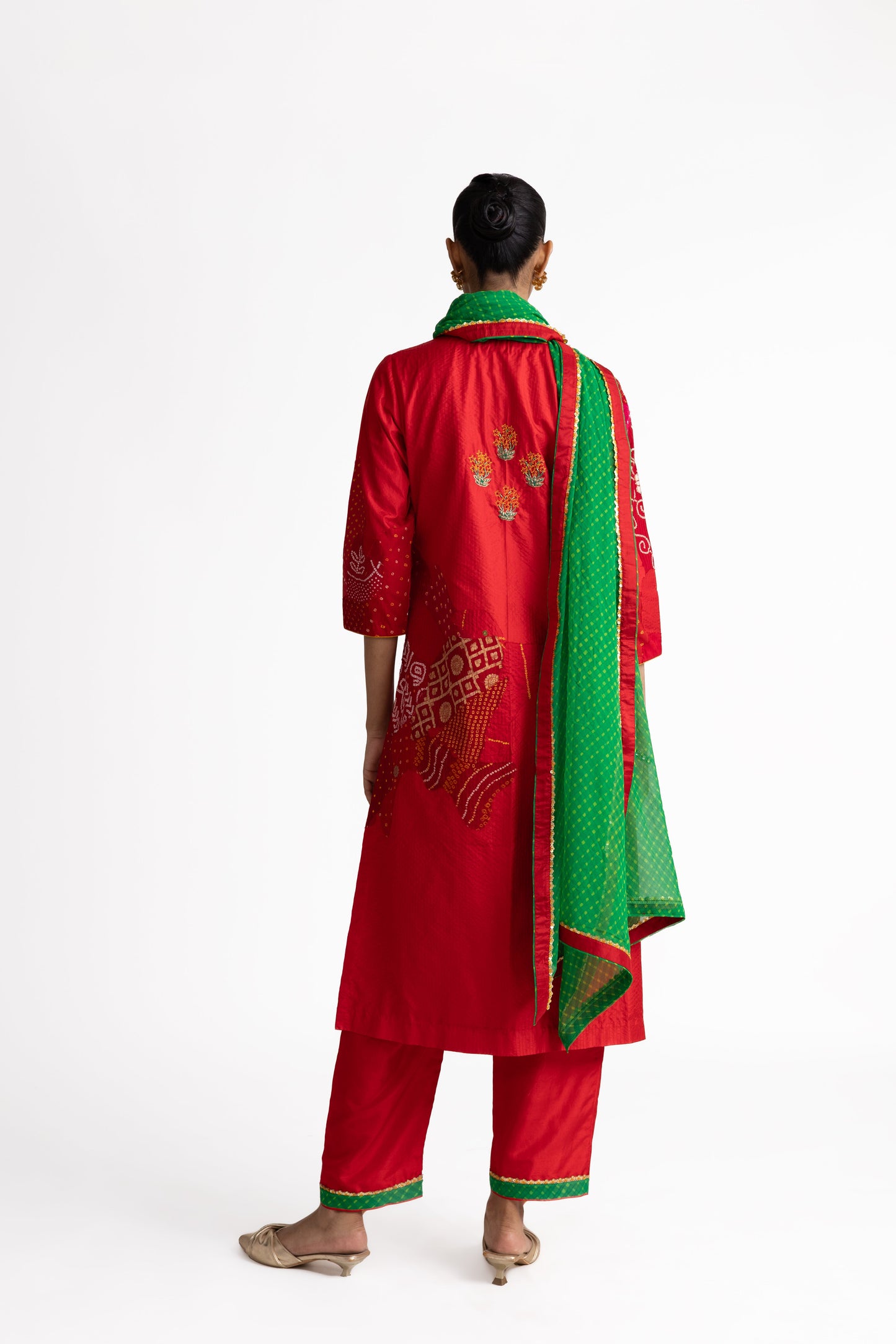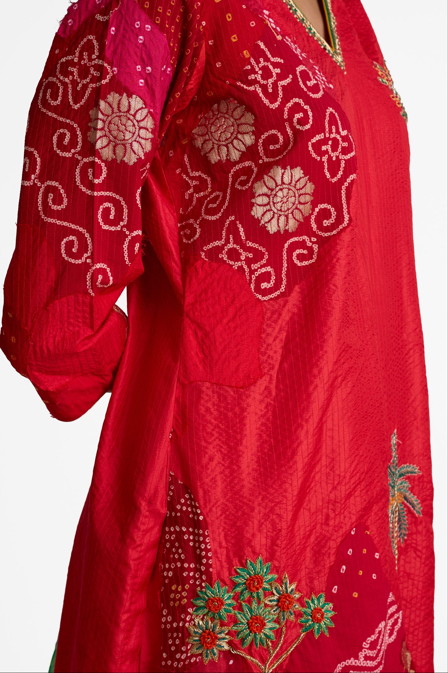 This is a silk kurta that comes with abstract boro placement of Bandhani silk patches. Hand embroidered florals and trees, are placed on the chest, sleeves, bottom and back of the kurta. It comes clubbed with a leheriya georgette dupatta and silk pants.