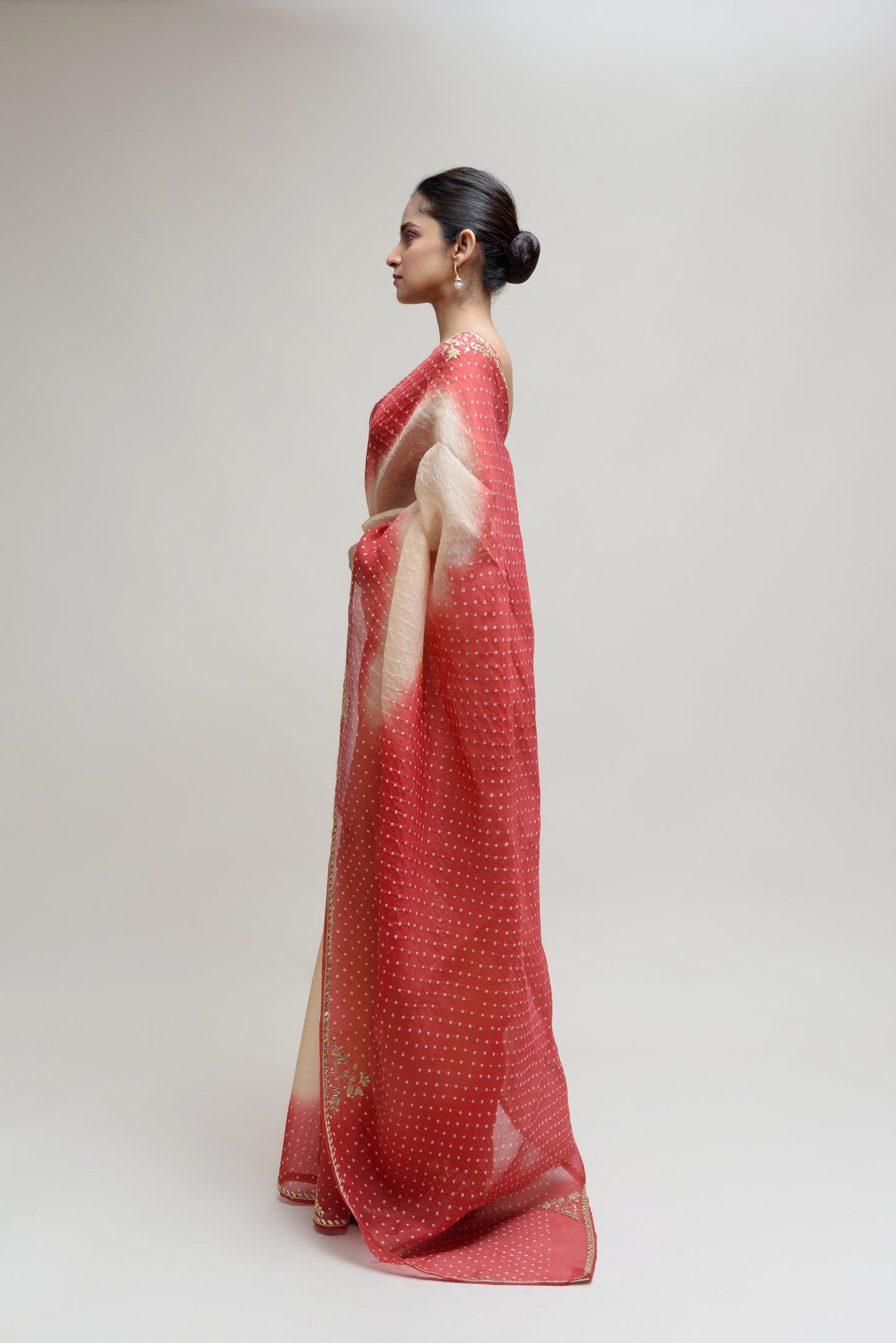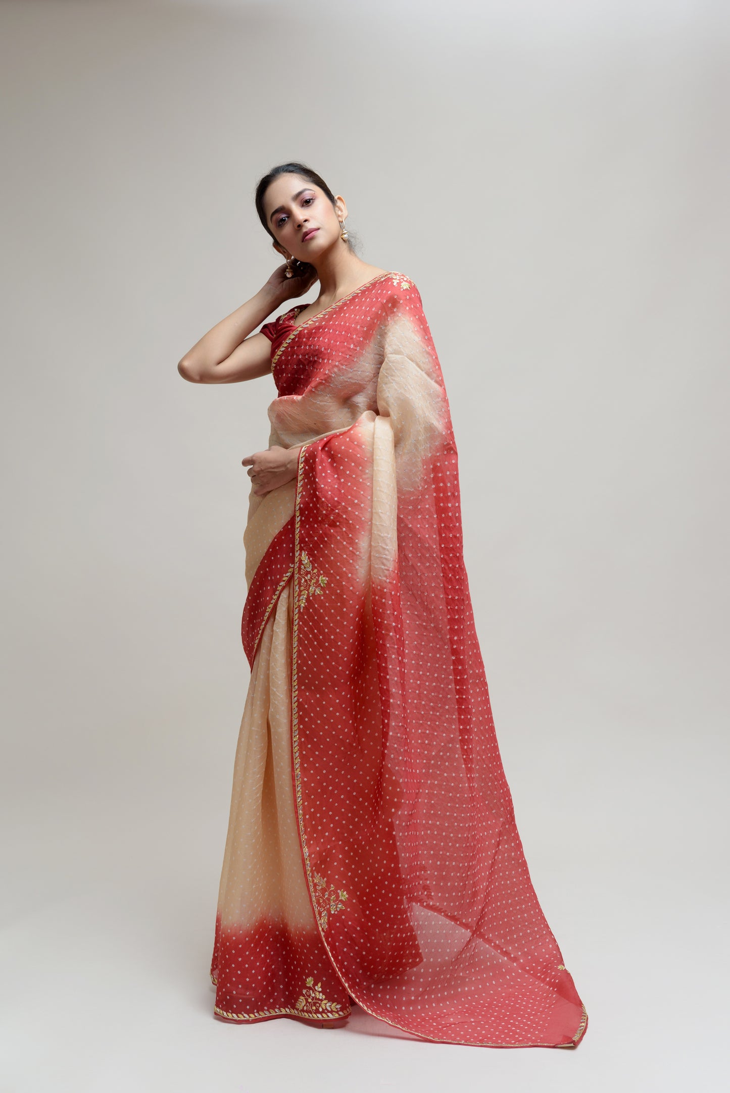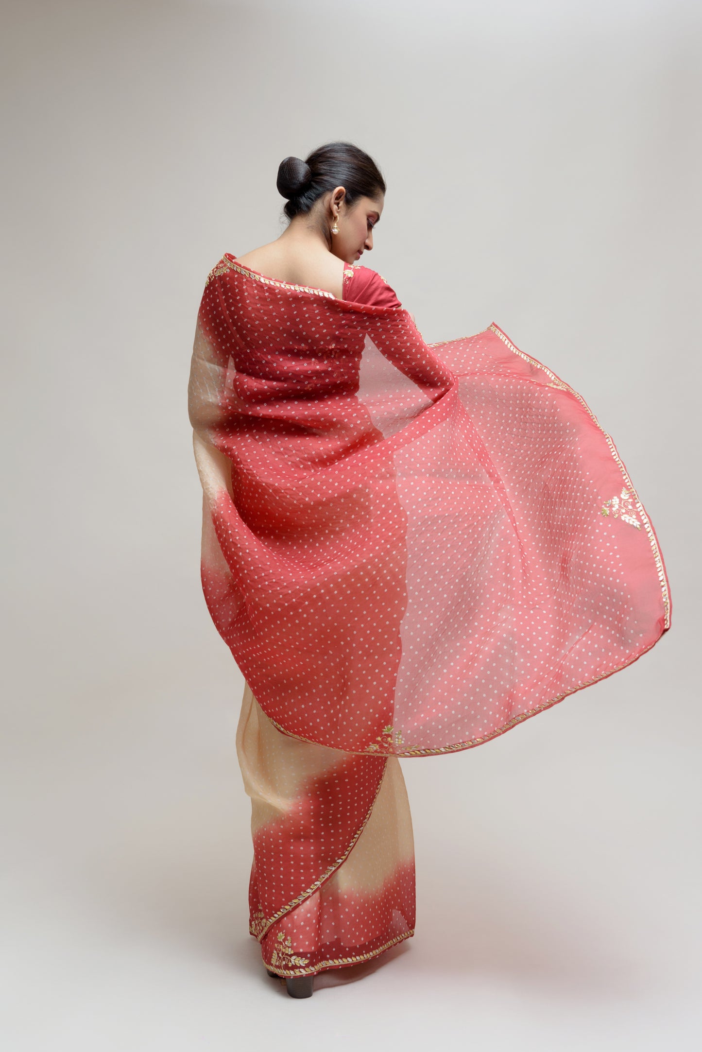 Bandhani on Organza Saree with Gota Patti - Beige Maroon