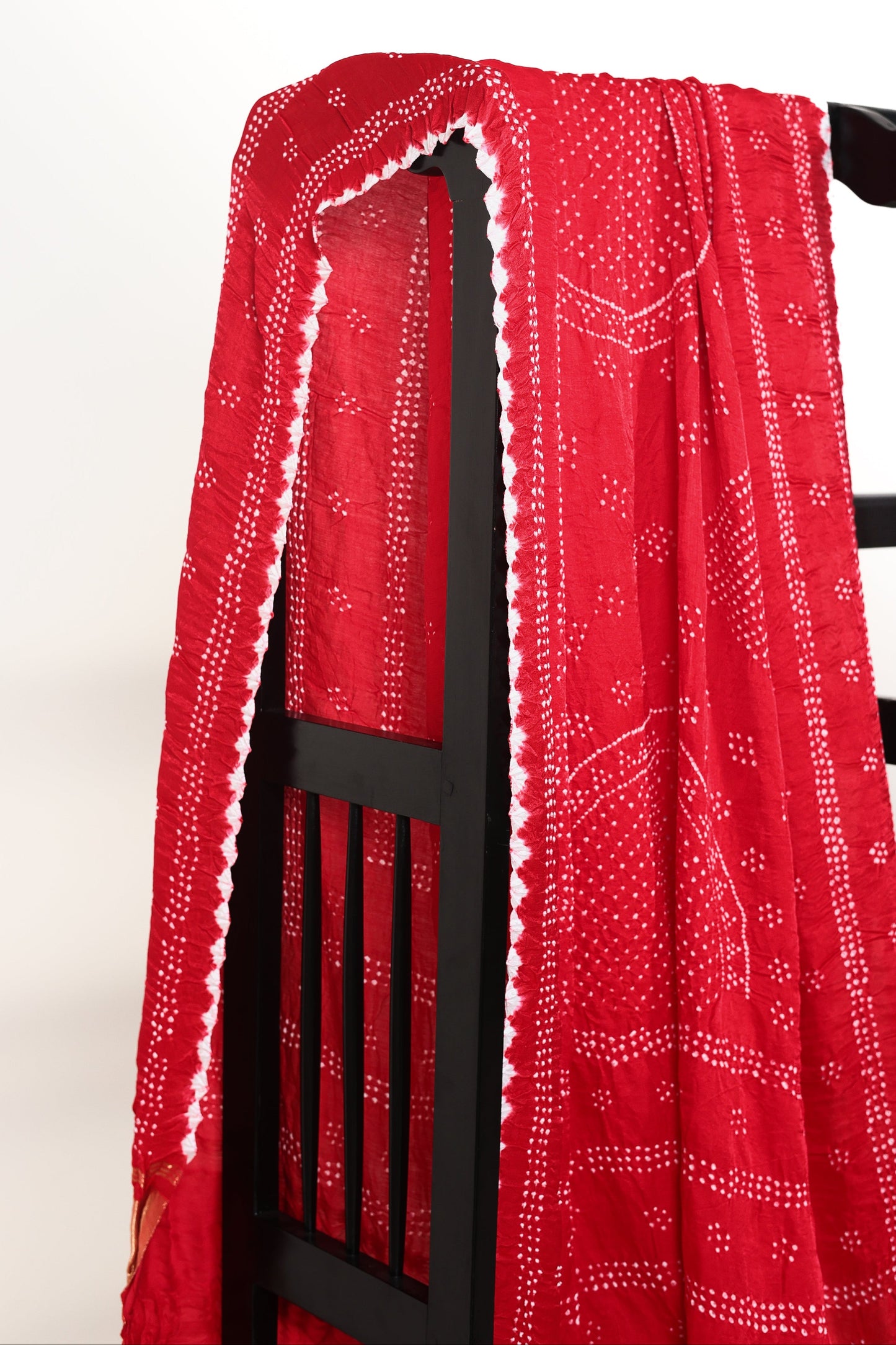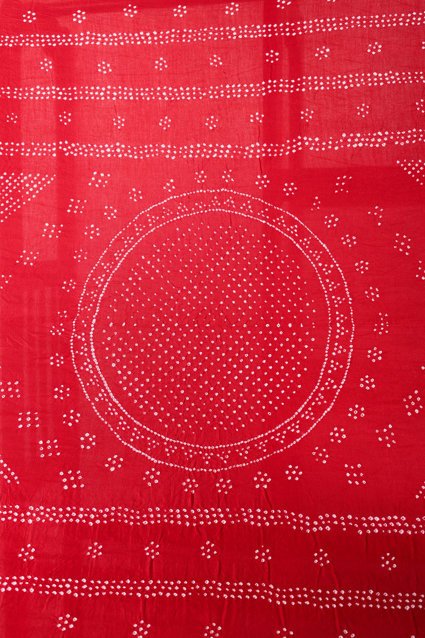 This is a Bandhani on gaji silk dupatta which features a circle motif in the centre and two half semi circles on either side. Both short ends of the dupatta features a woven zari border. The edges features white Bandhani resist dyed pattern. This dupatta is 2.5 metres in length.
