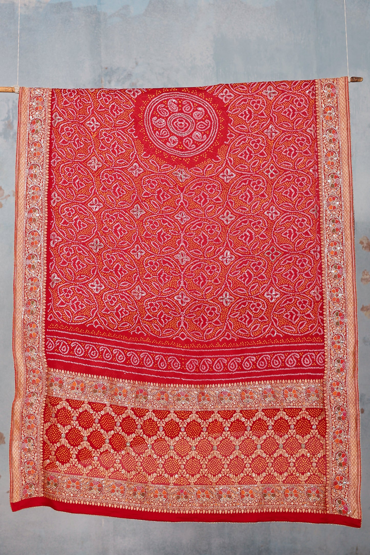 This is a red Shikari Bandhani banarasi dupatta in pure georgette. It comes with a circular Bandhani motif featuring paisleys in the center of the dupatta. The Bandhani is intricate and seamless, and is highlighted with hand embroidered zardozi, resham and mukaish. The floral banarasi woven border is highlighted with dori, tiki & resham. This dupatta is 2.5 meter in length.
