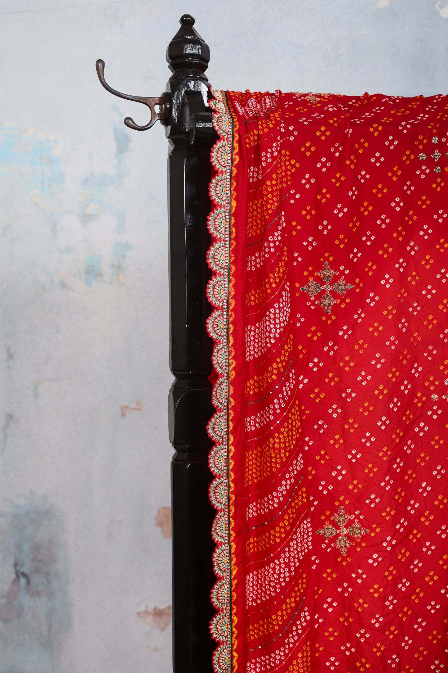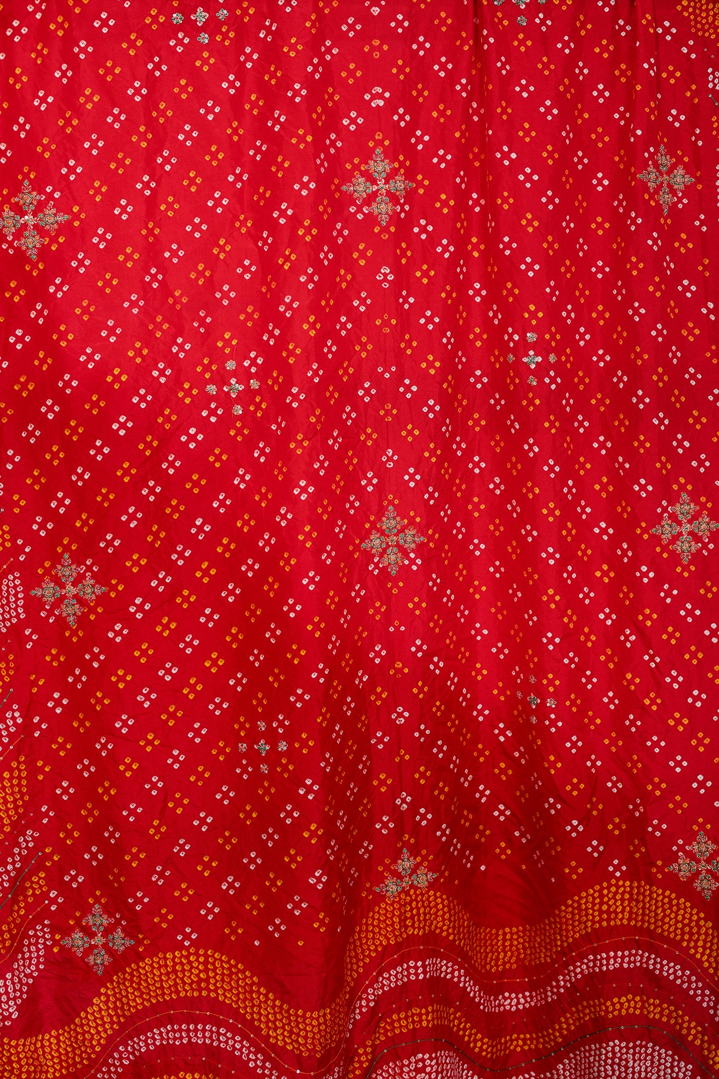 This is a red pure silk dupatta, that features wave like Bandhani pattern on both ends, and the central part features a floral Bandhani seamless pattern. The design is interspaced with hand embroidered resham & zardozi flowers. The edges comes lined with hand embroidered & scalloped zardozi border. This dupatta is 2.5 mts in length.