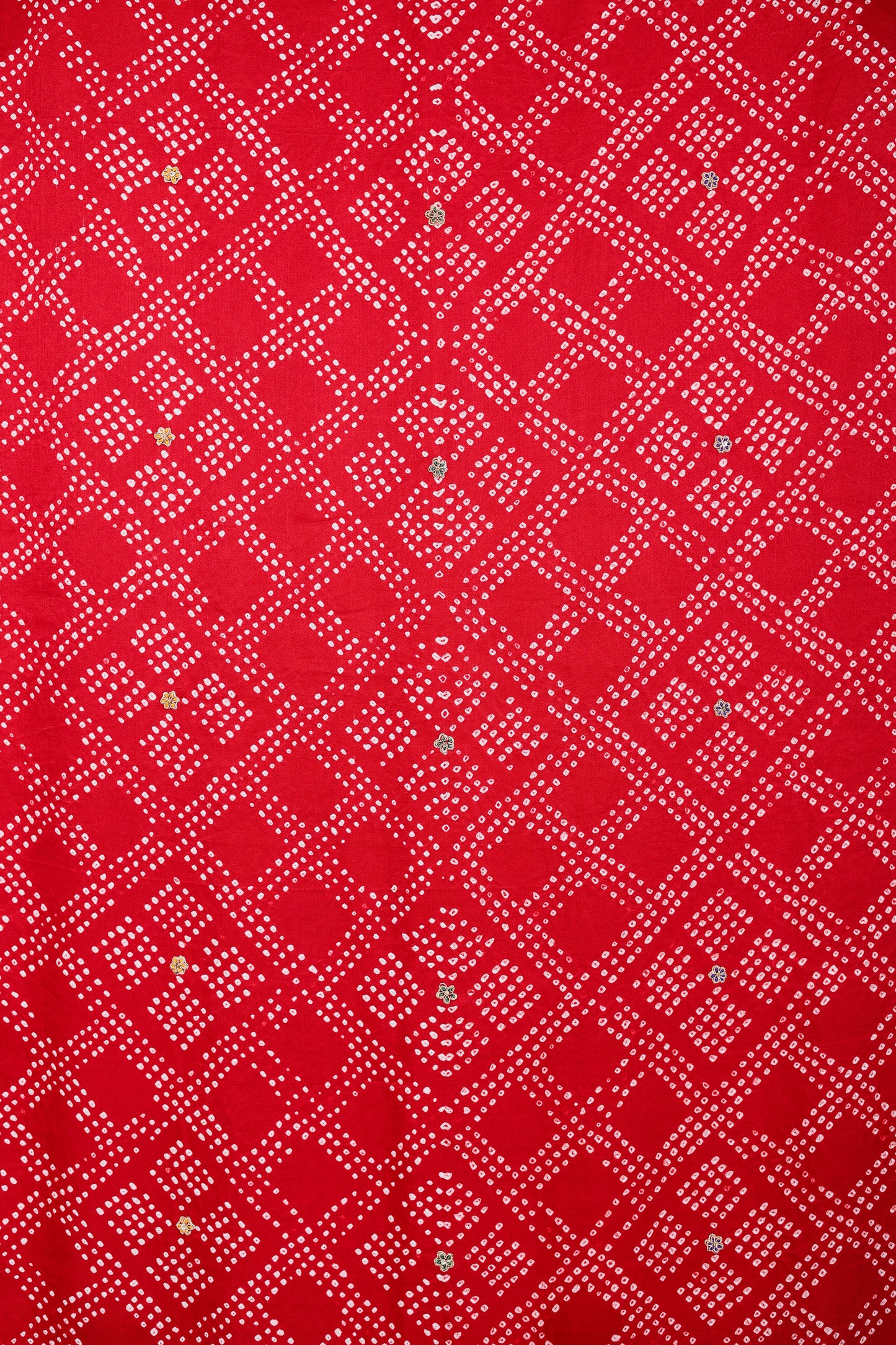This is Bandhani on gaji silk dupatta in red. The seamless geometric pattern of Bandhani is interspaced with zardozi bootis. The scalloped border on contrast rani silk features hand embroidered zardozi paisleys complemented with scalloped border edging. This dupatta is 2.5 metres in length.