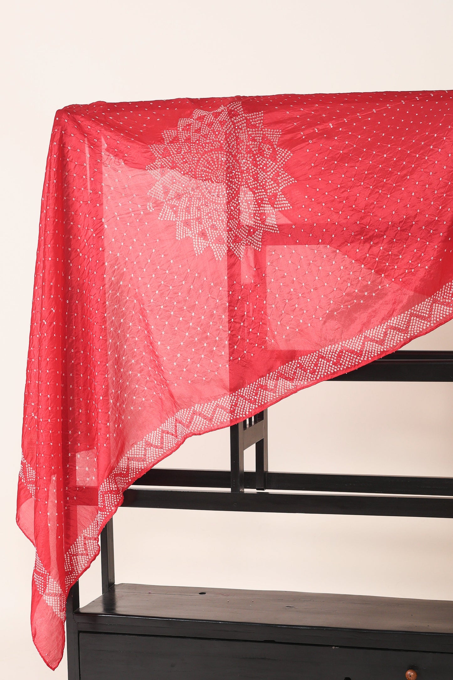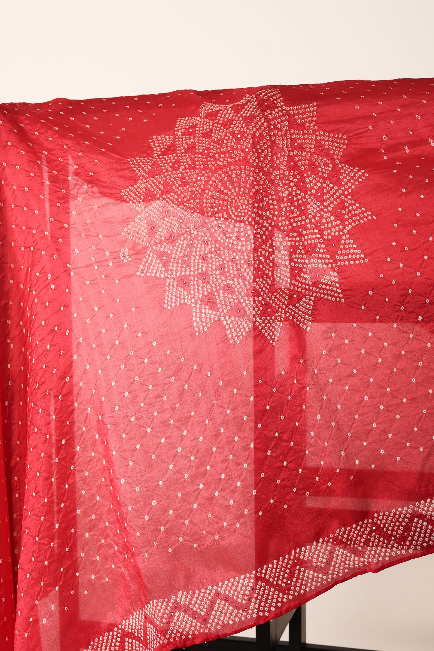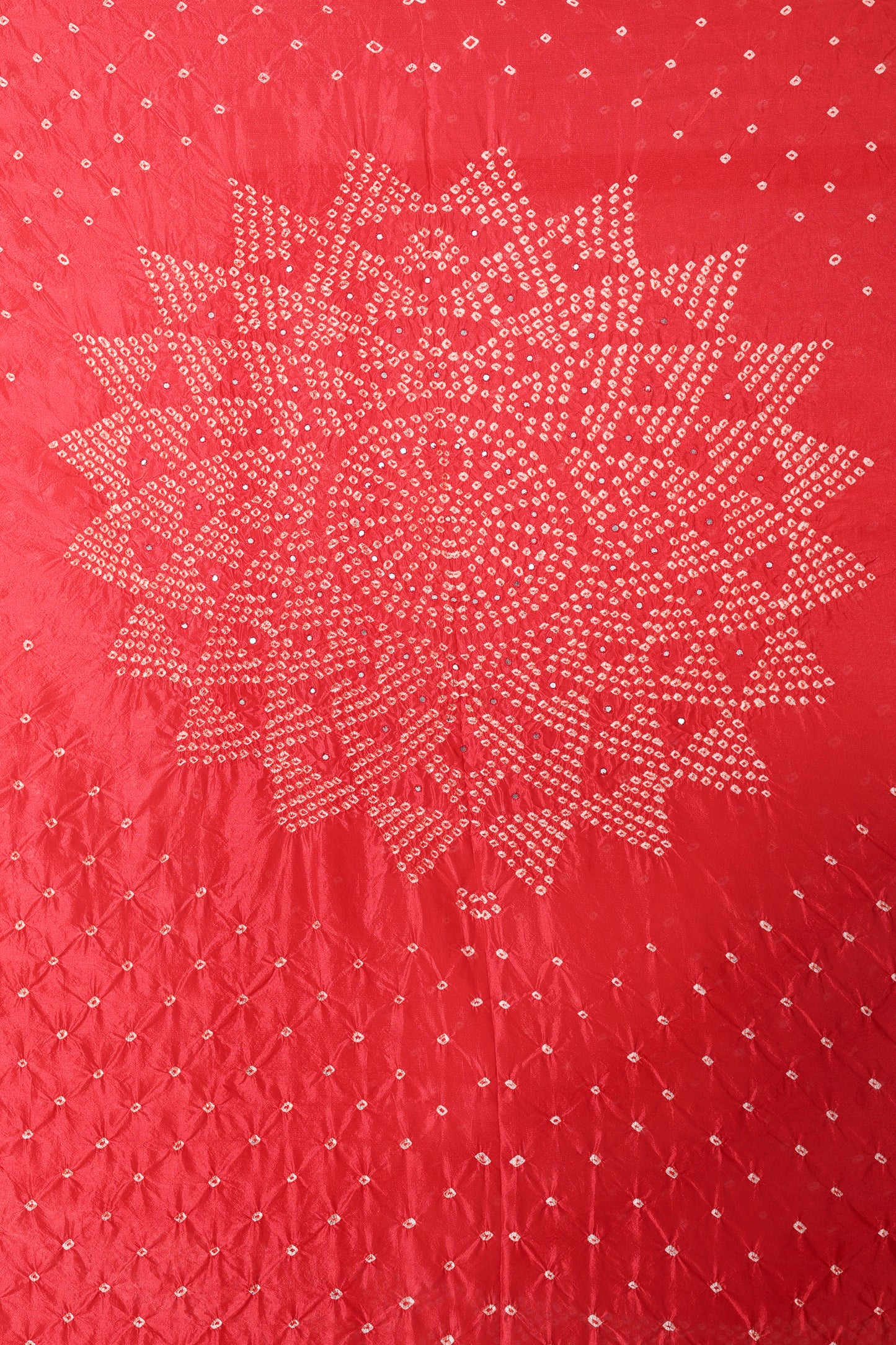 This is Bandhani on silk organza dupatta in red. The design features a central floral motif, interspaced with hand embroidered mirror work. All four sides features a geometric chevron border. The edges of the dupatta features pearl detailing.