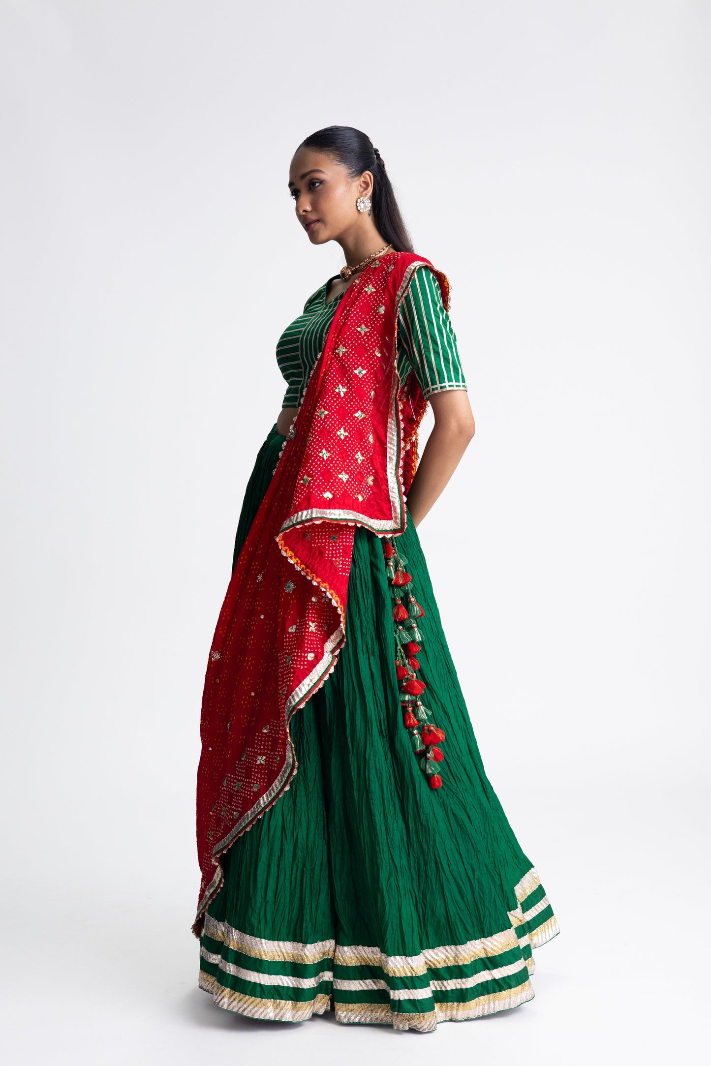 This is green crush skirt with gota lampi borders. It comes clubbed with a red Bandhani on silk dupatta that comes embellished with folded gota hand embroidered work. The blouse is green silk with gota lampi highlights.