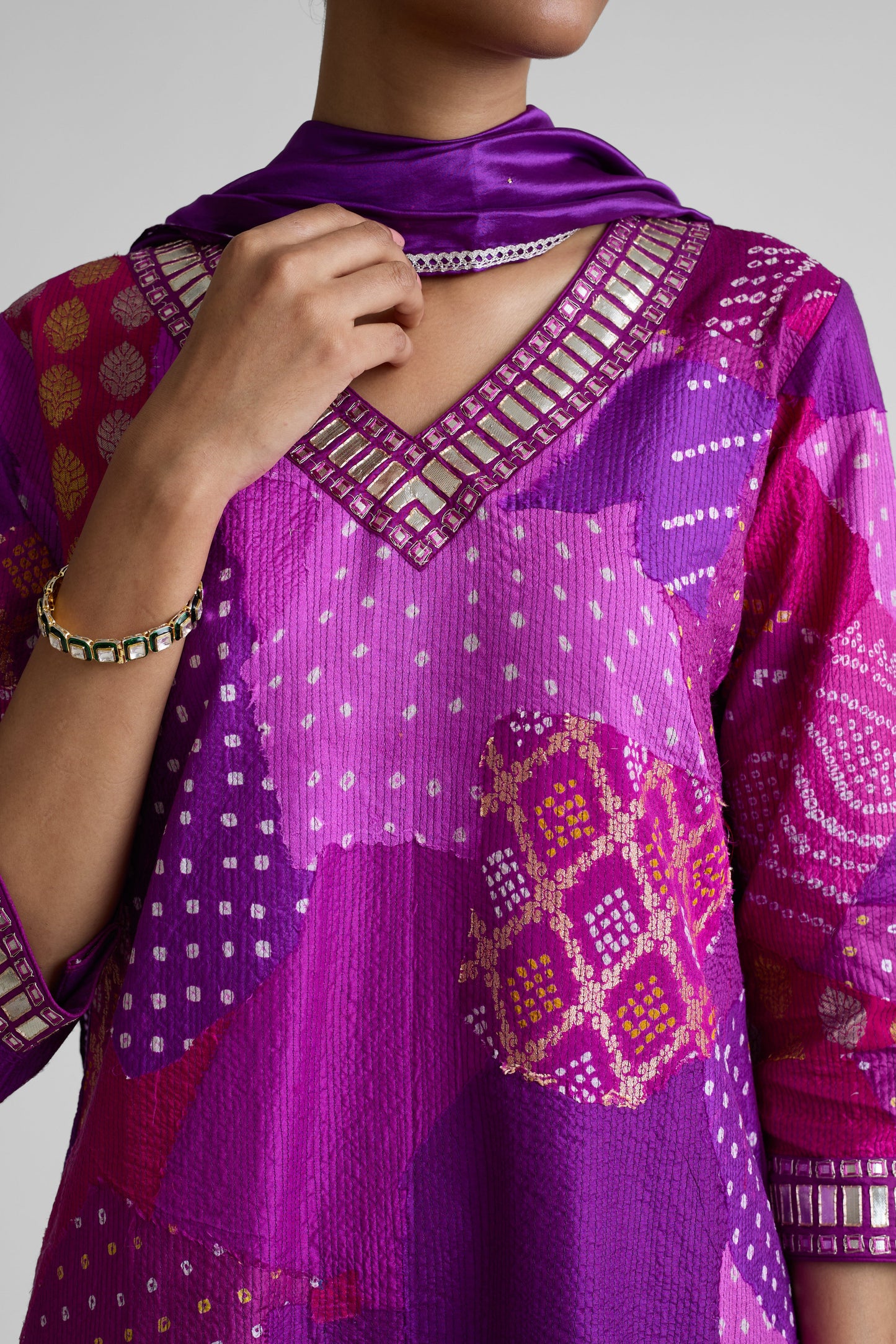 This is a purple patchwork kurta that comes embellished with hand embroidered gota work on the neck and sleeves. It comes clubbed with a silk organza stole in purple, that is hand embroidered with mukaish work. The pants are plain in silk.