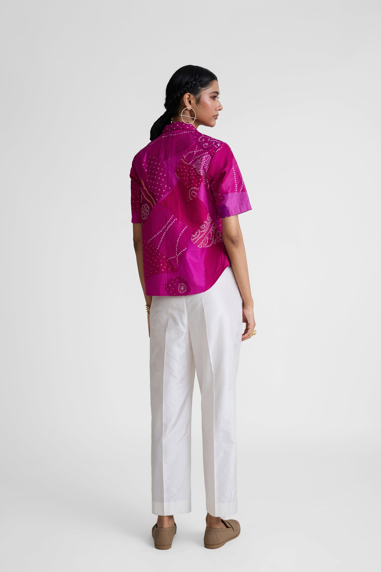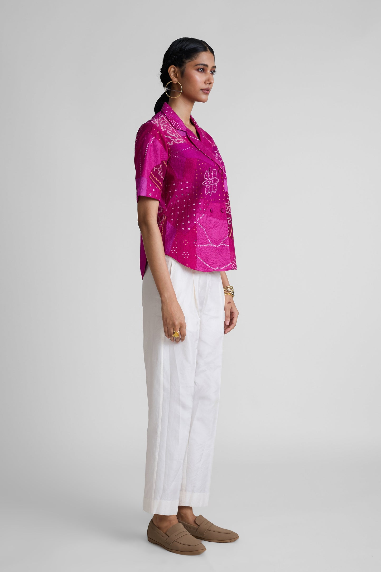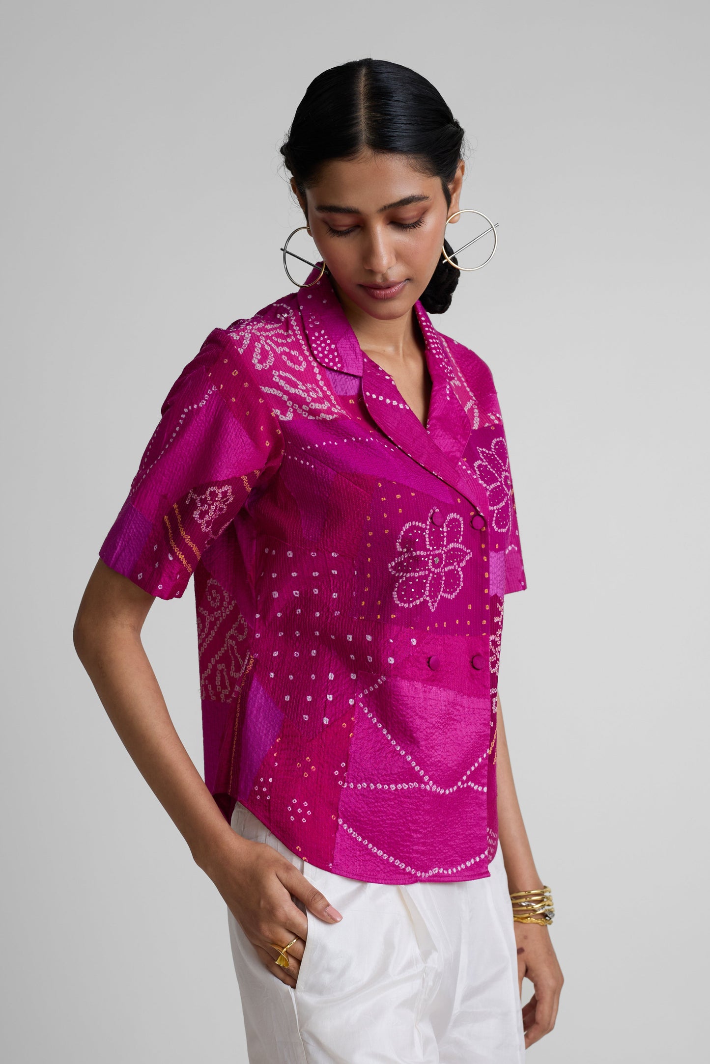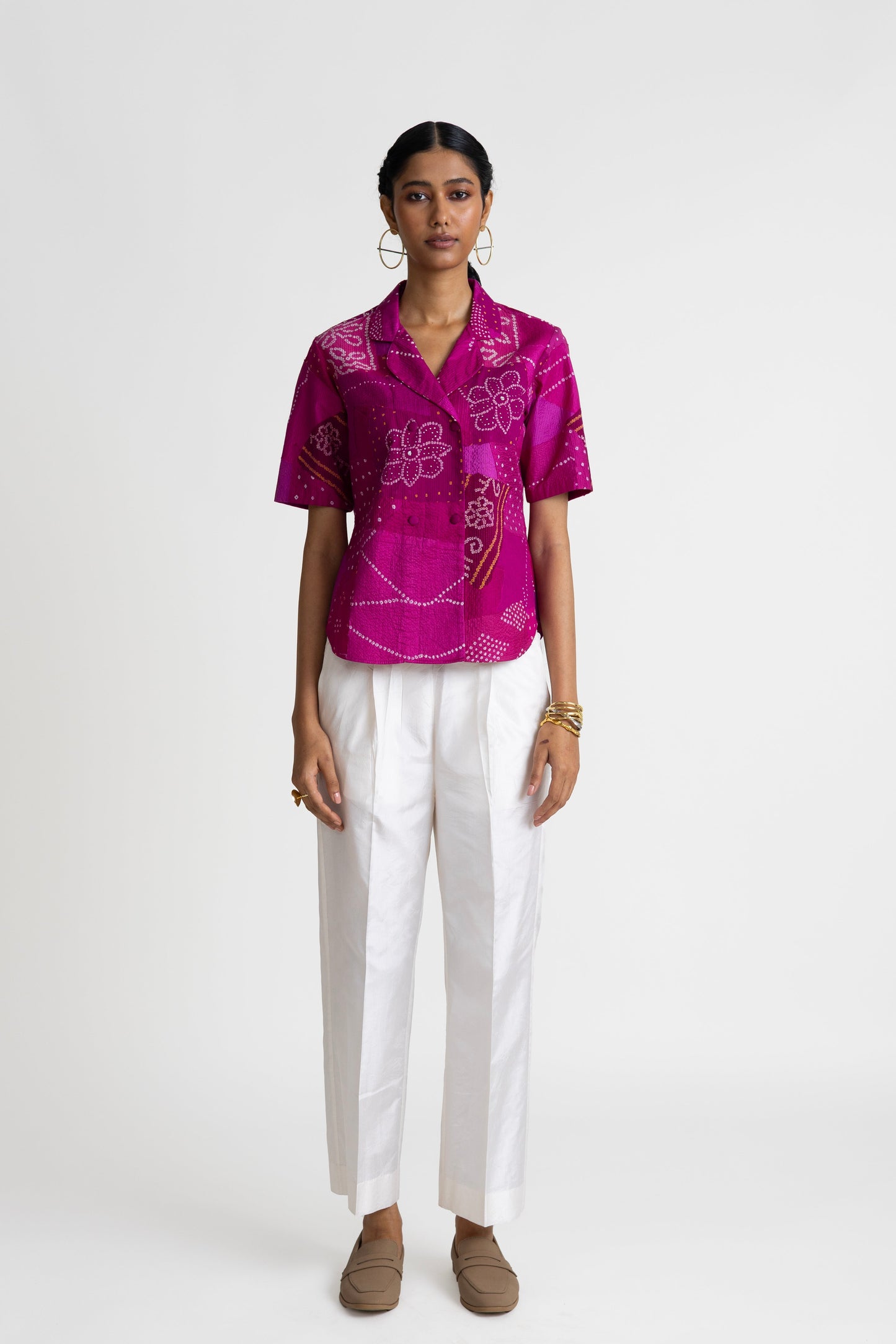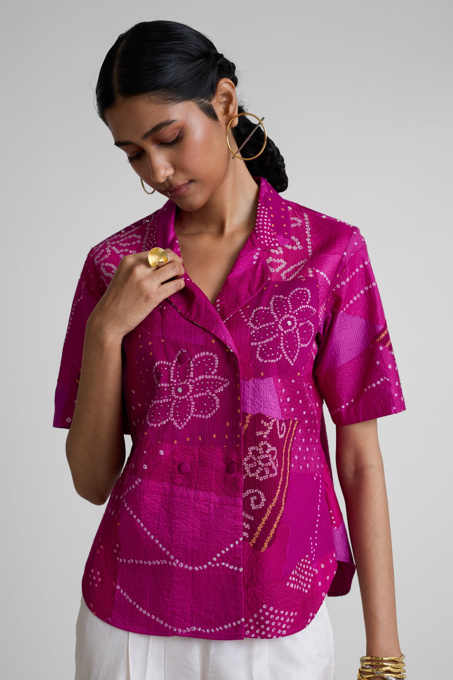 This is patchwork Bandhani shaket in magenta. It can be worn both ways, buttoned up a shirt or buttoned down as a jacket.