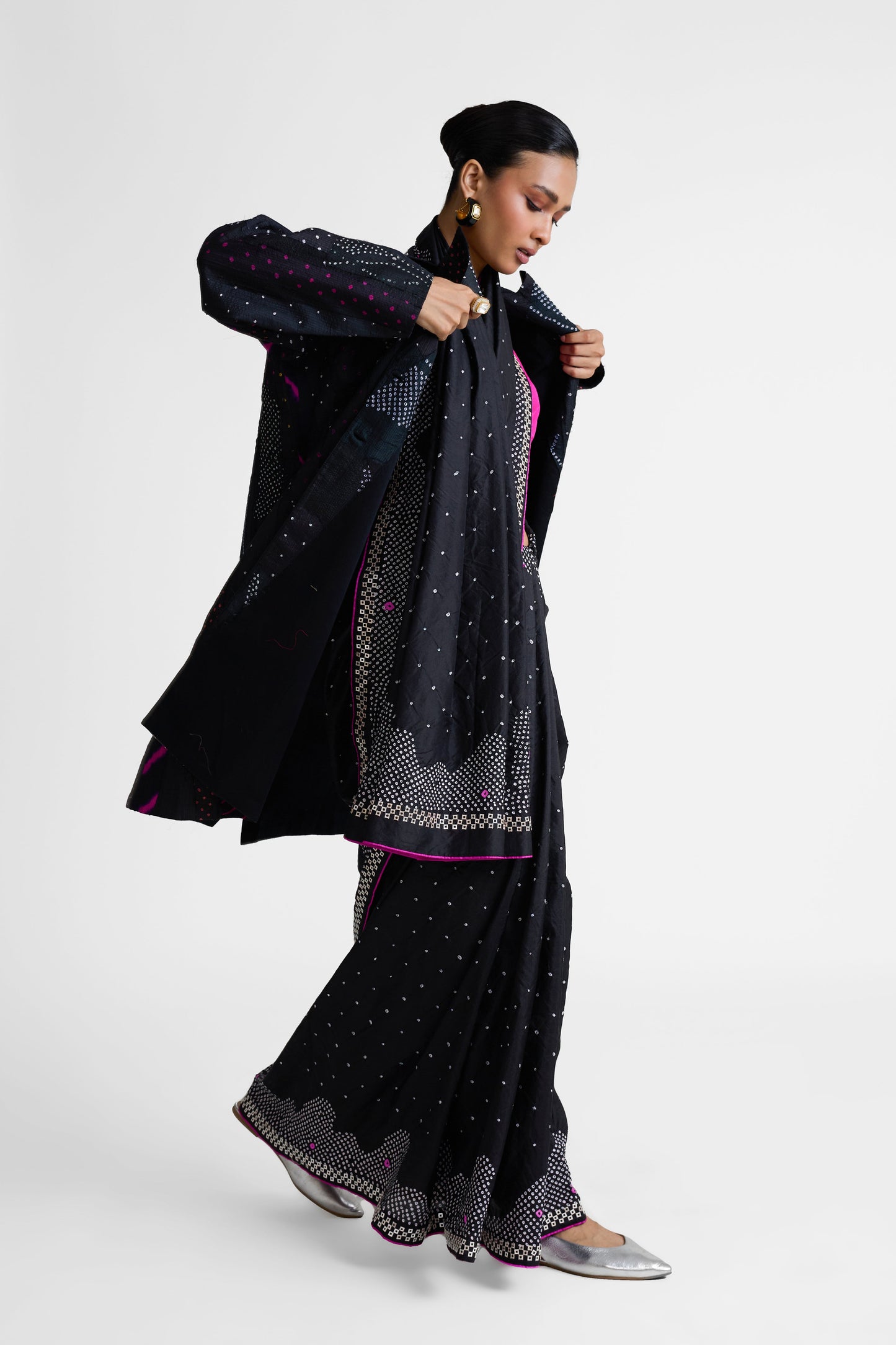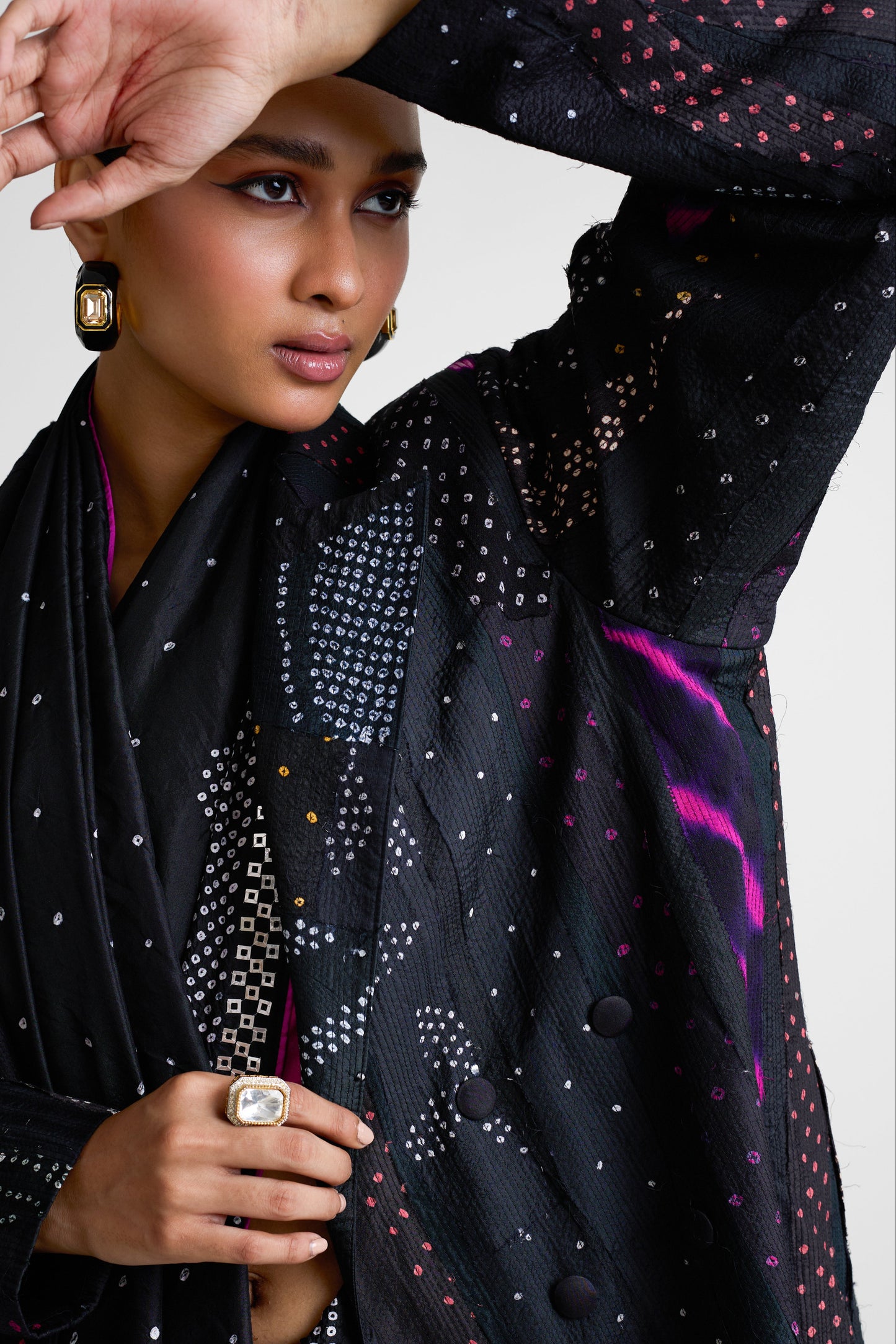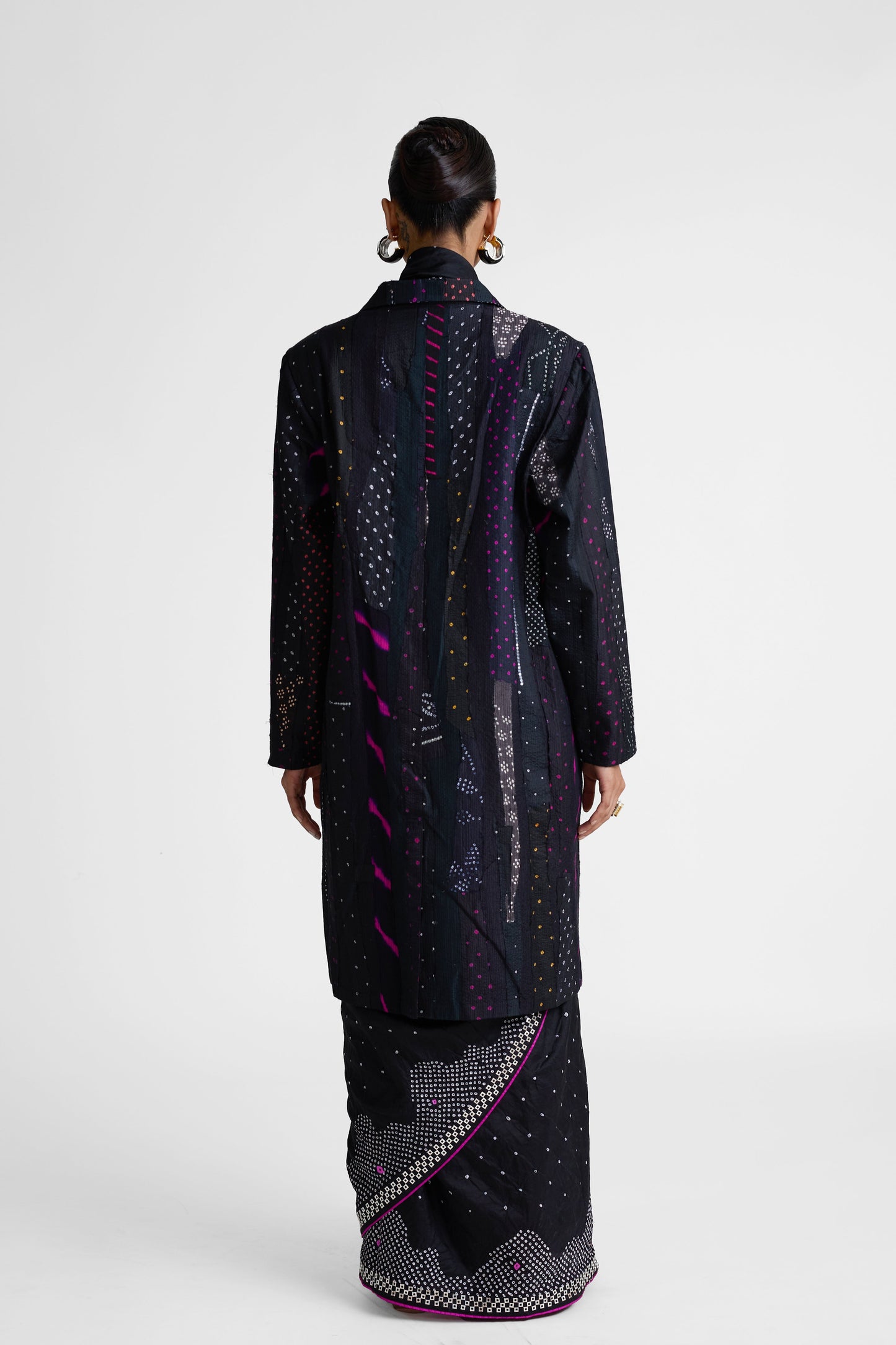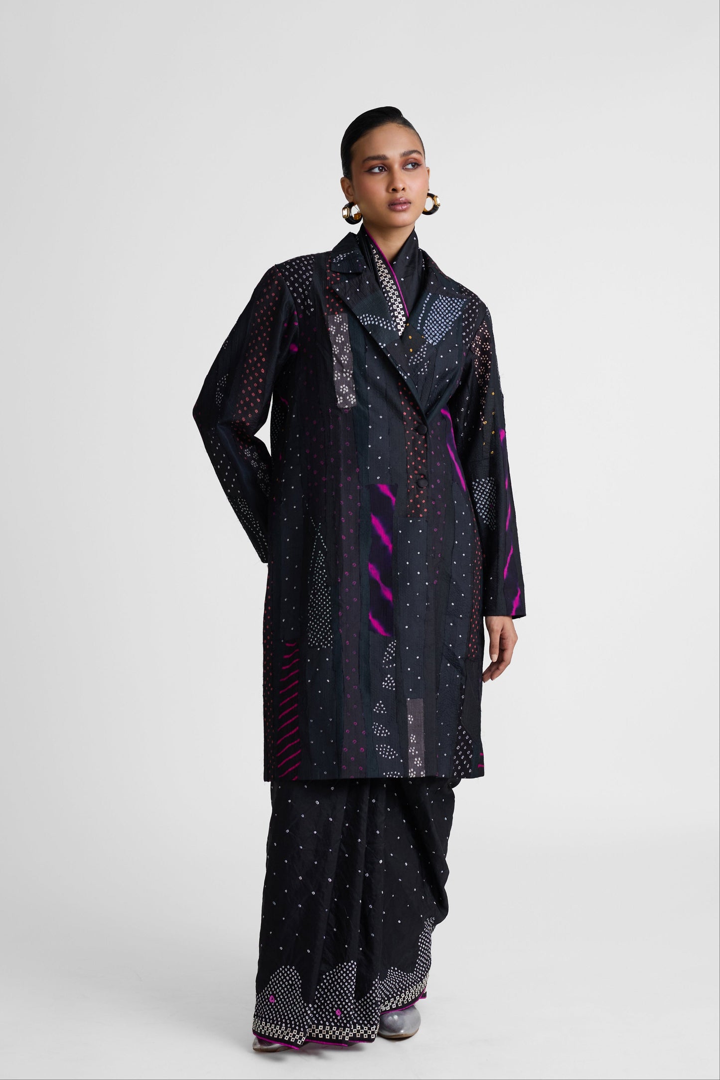 This is a patchwork Bandhani on silk long jacket, perfect to be clubbed with sarees as an outerwear. Alternatively, they can be styled with trousers along with crop or tank tops. Pair it with Ripple Saree.