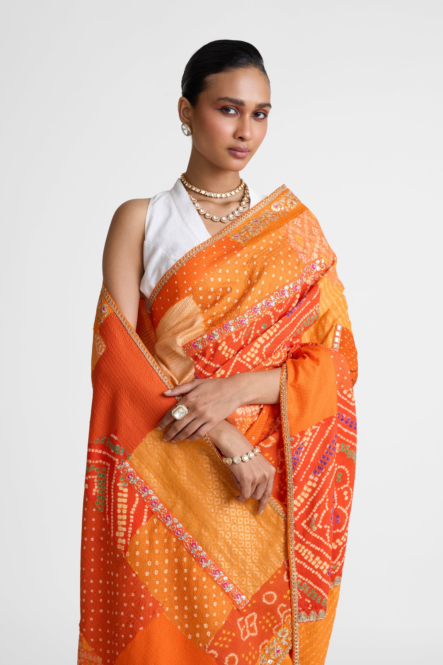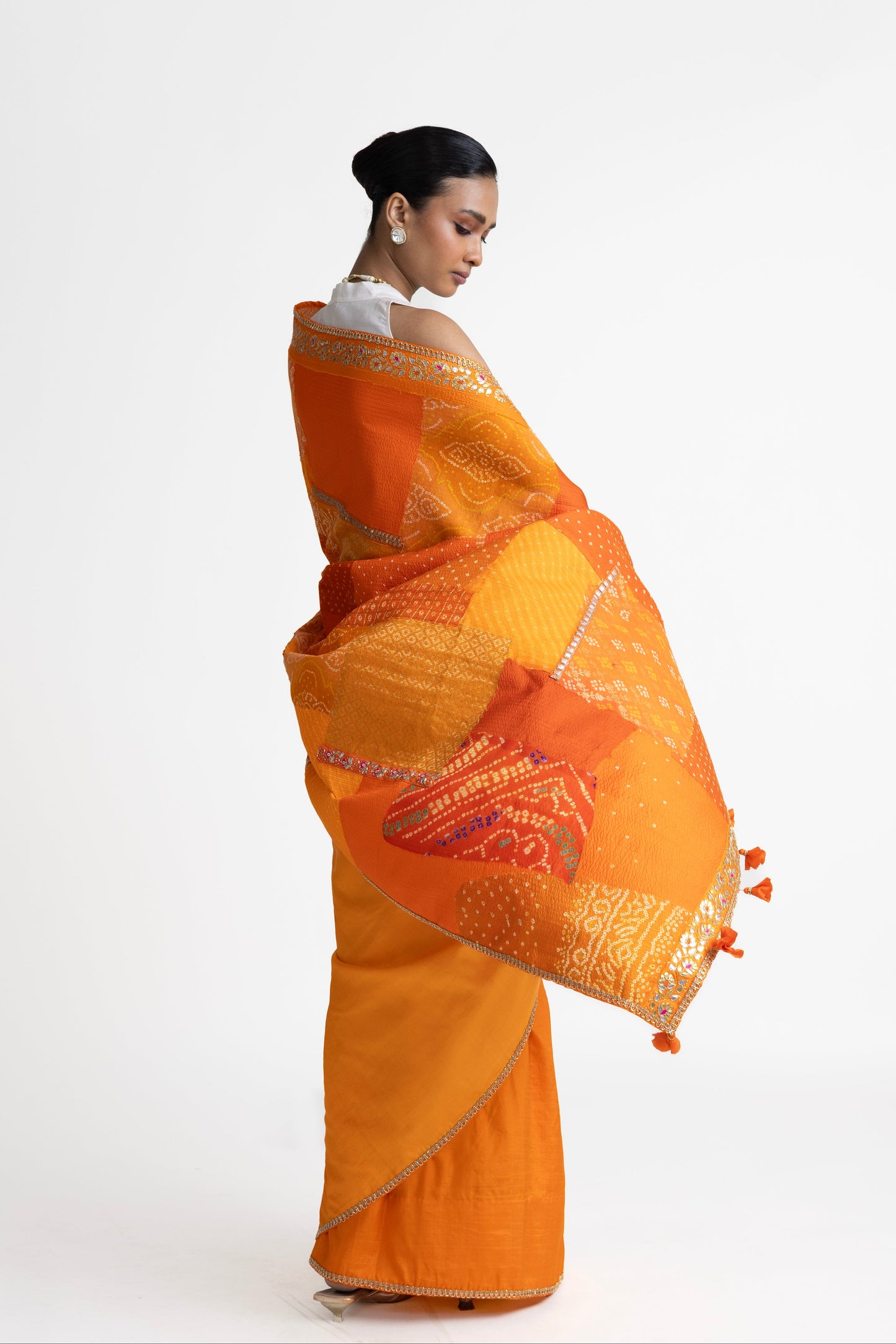 This is a Bandhani Patchwork Saree on Silk that has a unique palla made by using organic shapes of Bandhani patches put together using the quilting method. Hand embroidered gota patti borders interspaces these patches making the look festive. The saree comes with a Bandhani on Silk blouse piece in orange.