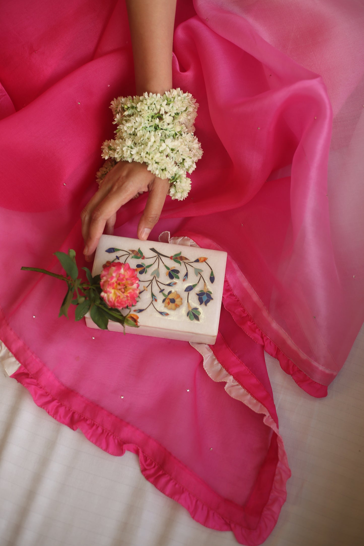 This is a pink shaded pure organza saree that comes dotted with hand done mukaish. The edges are finished with silk frill. It comes clubbed with Bandhani on Silk blouse, which has a back hook closure.