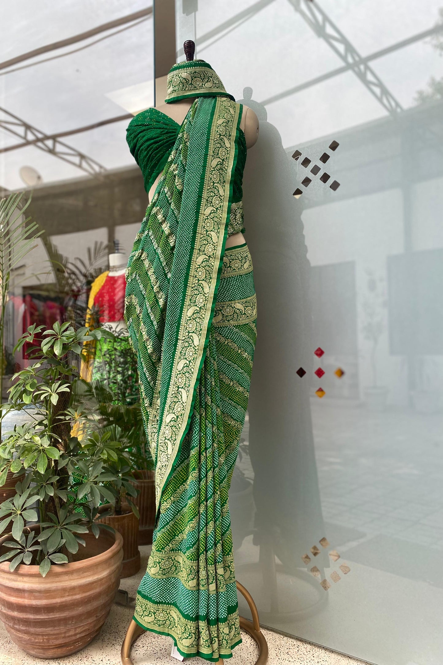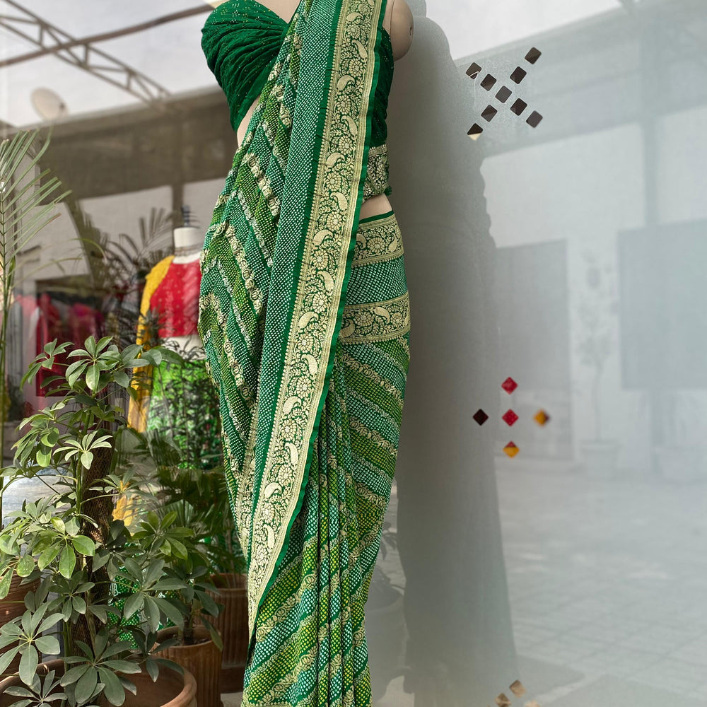 Light Meenakari Banarasi Bandhani Saree-Red And Green