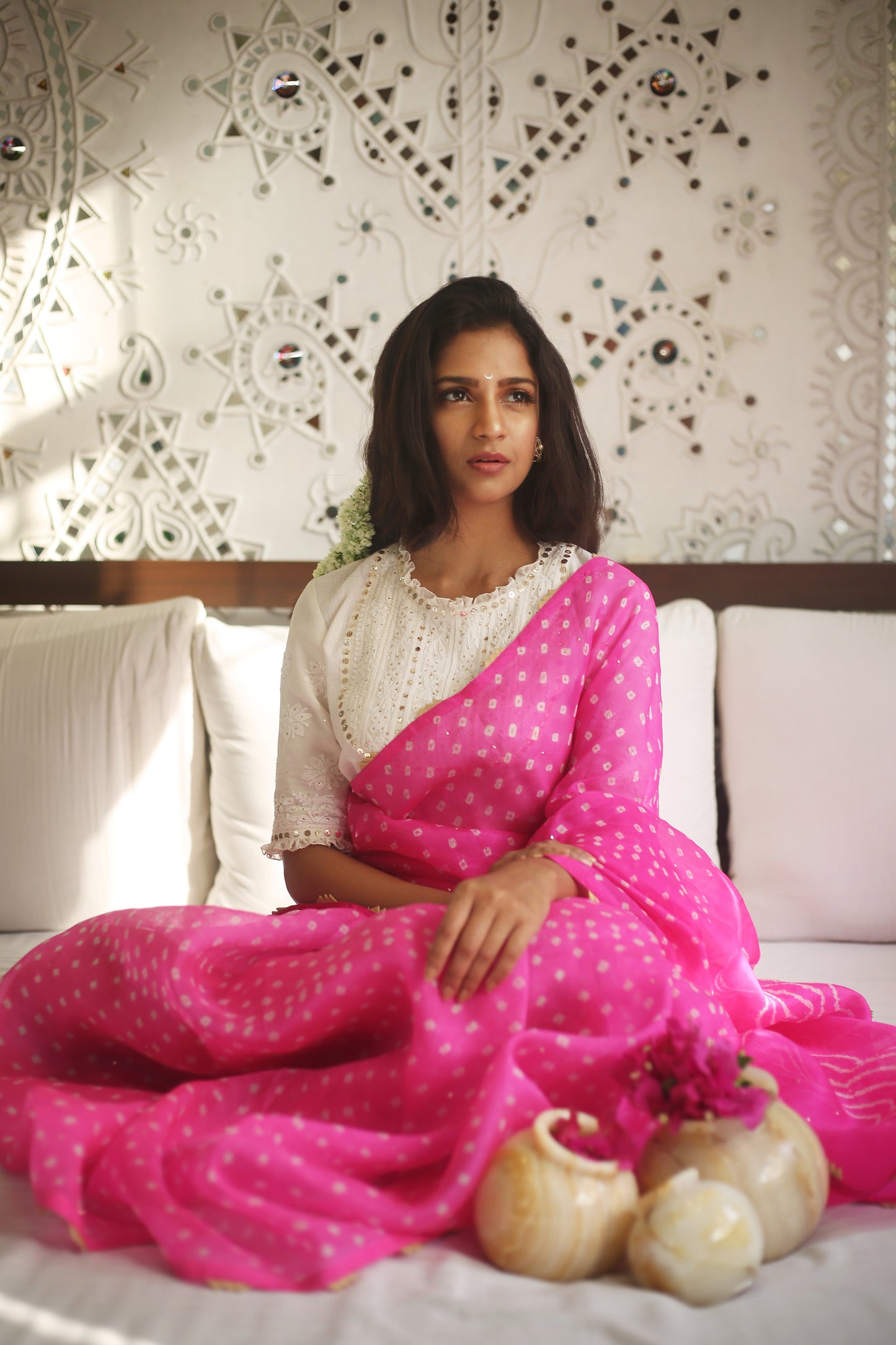 Soft and Versatile - this Bandhani on Organza Saree is a carefree ensemble that is classy and evergreen. Bandhani dots coupled with Tara is like a star studded sky. Wear it in or outdoors, it is sure to turn heads wherever you go. The saree comes with its own pure silk blouse piece. The blouse as in the image is suggestive.