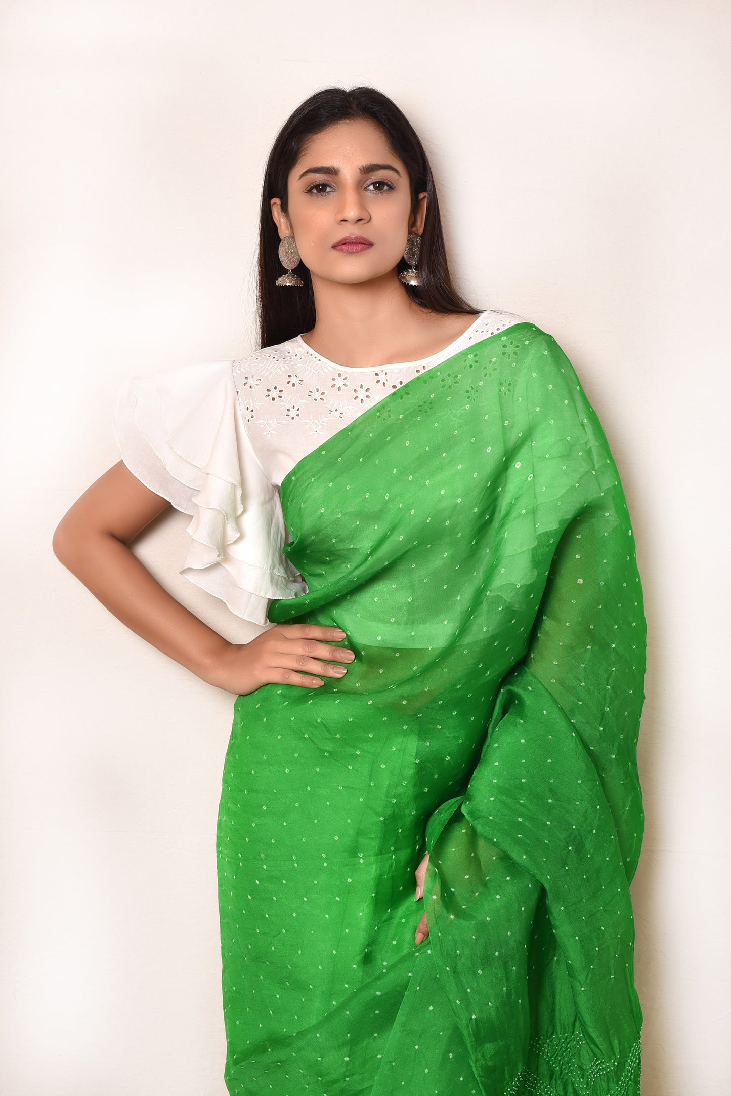 Soft and Versatile - this Bandhani on Organza Saree is a carefree ensemble that is classy and evergreen. Bandhani dots flank the body of the saree like star studded sky. The pearl tassels on the edge of the pallu finishes the look.