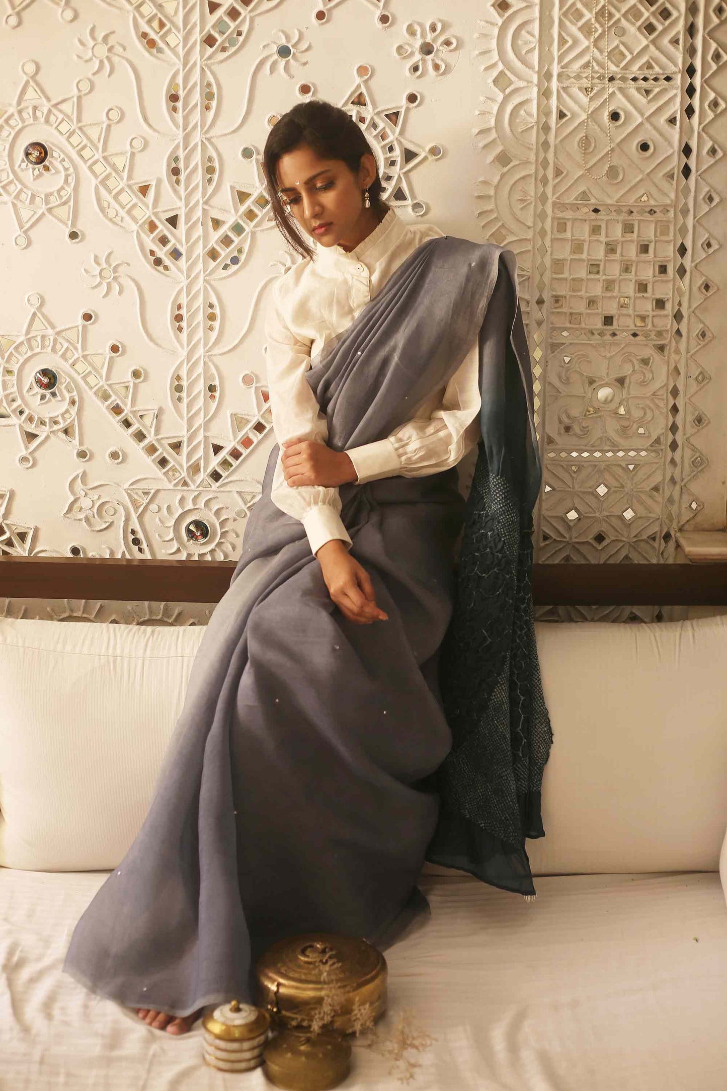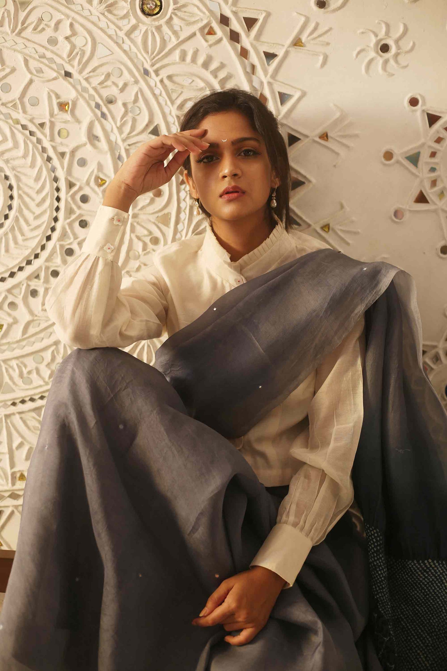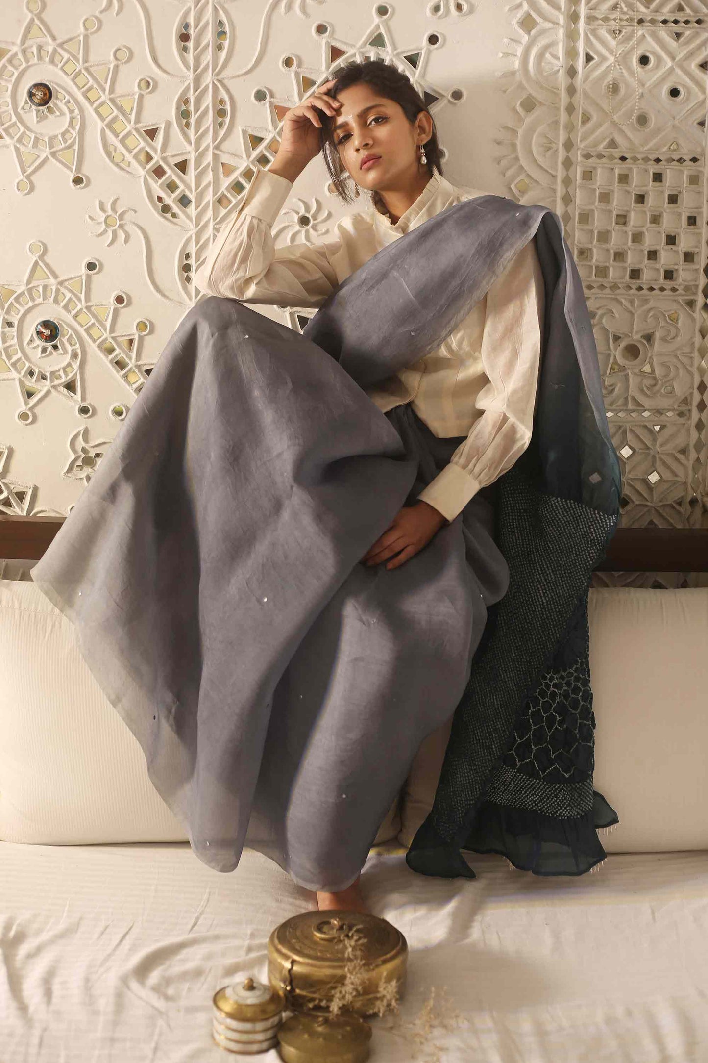 This classic and gorgeous handwoven organza sarees comes in a lovely shade of grey. The pallu is flanked by a big Bandhani motif, whereas the body is dotted with hand mirror work that lends vibrancy to the saree.