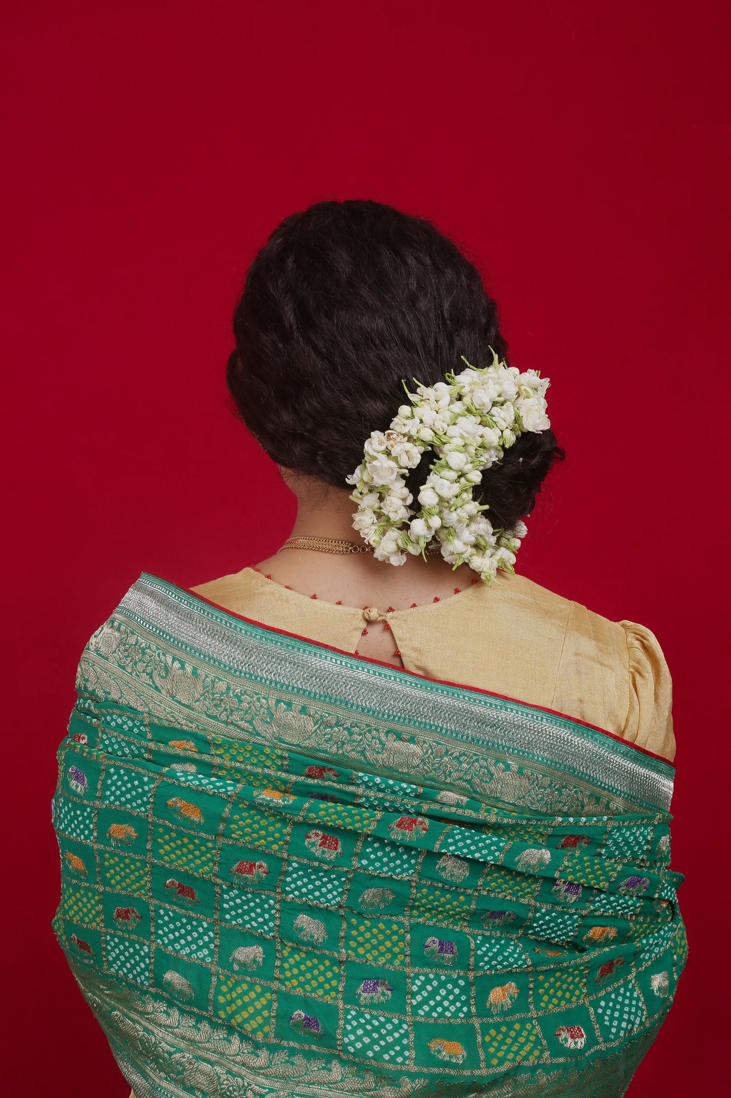 This saree with its carefully woven parade of elephants in bright colours is a true masterpiece. The gharchola pattern spread across the saree is filled with Bandhani dots in a harmonious manner. The green colour is serene, making it a must have for a wedding function or a part of the trousseau.