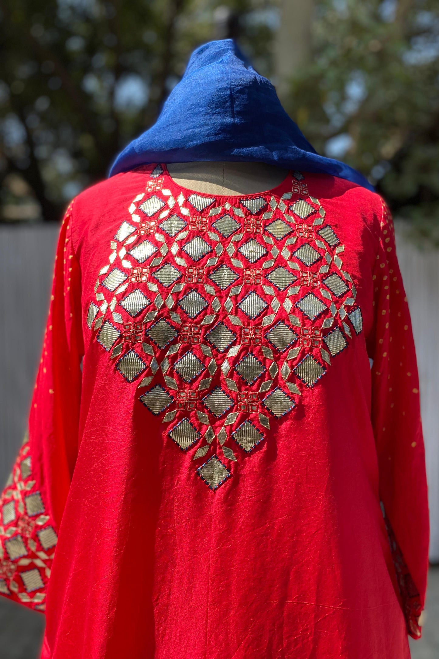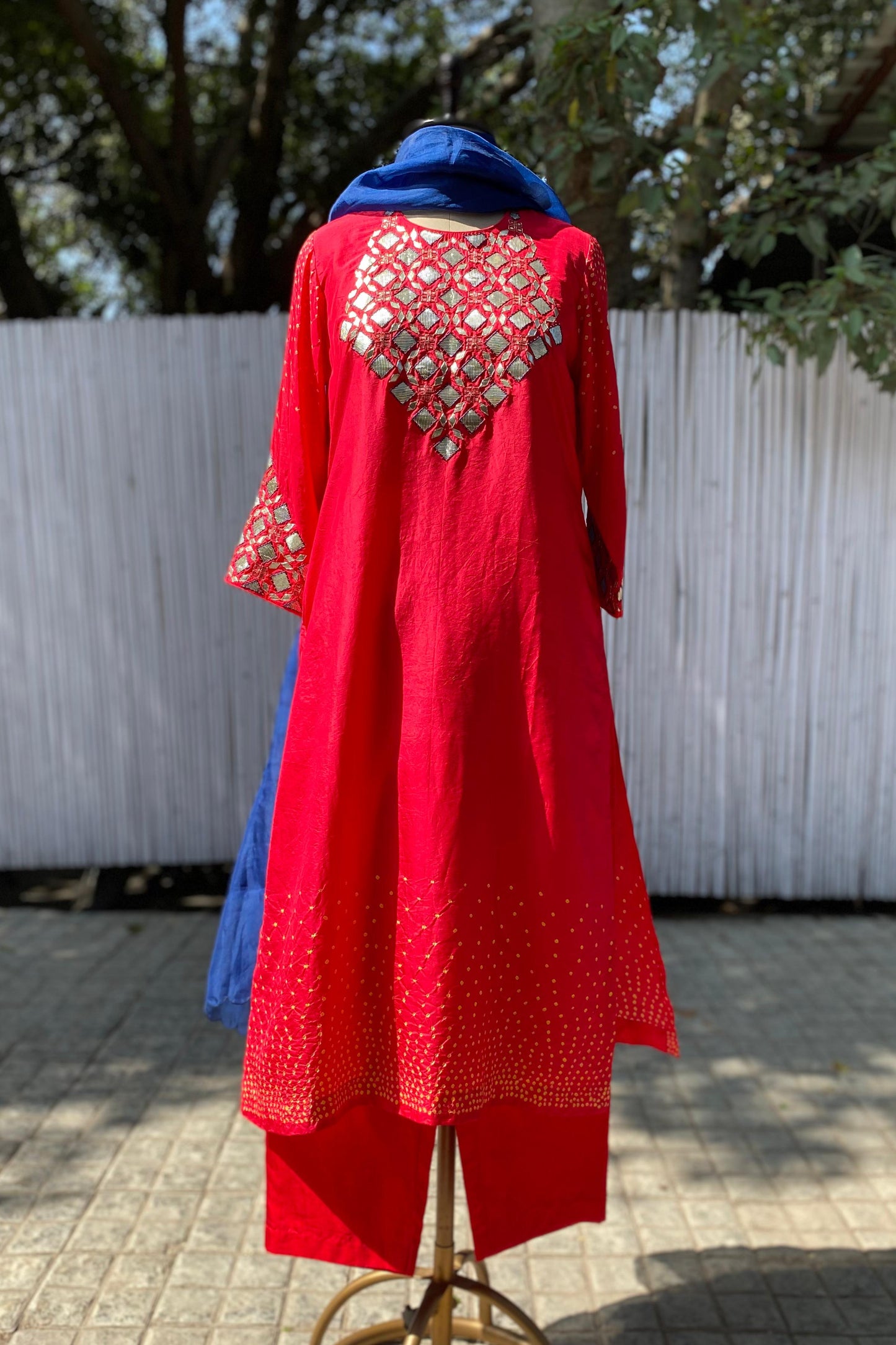 Regular price Rs. 28,500.00This Bandhani on pure silk kurta has a hand embroidered gota patti yoke. The work extends on the sleeves and back. It comes clubbed with red silk pants and blue organza stole.