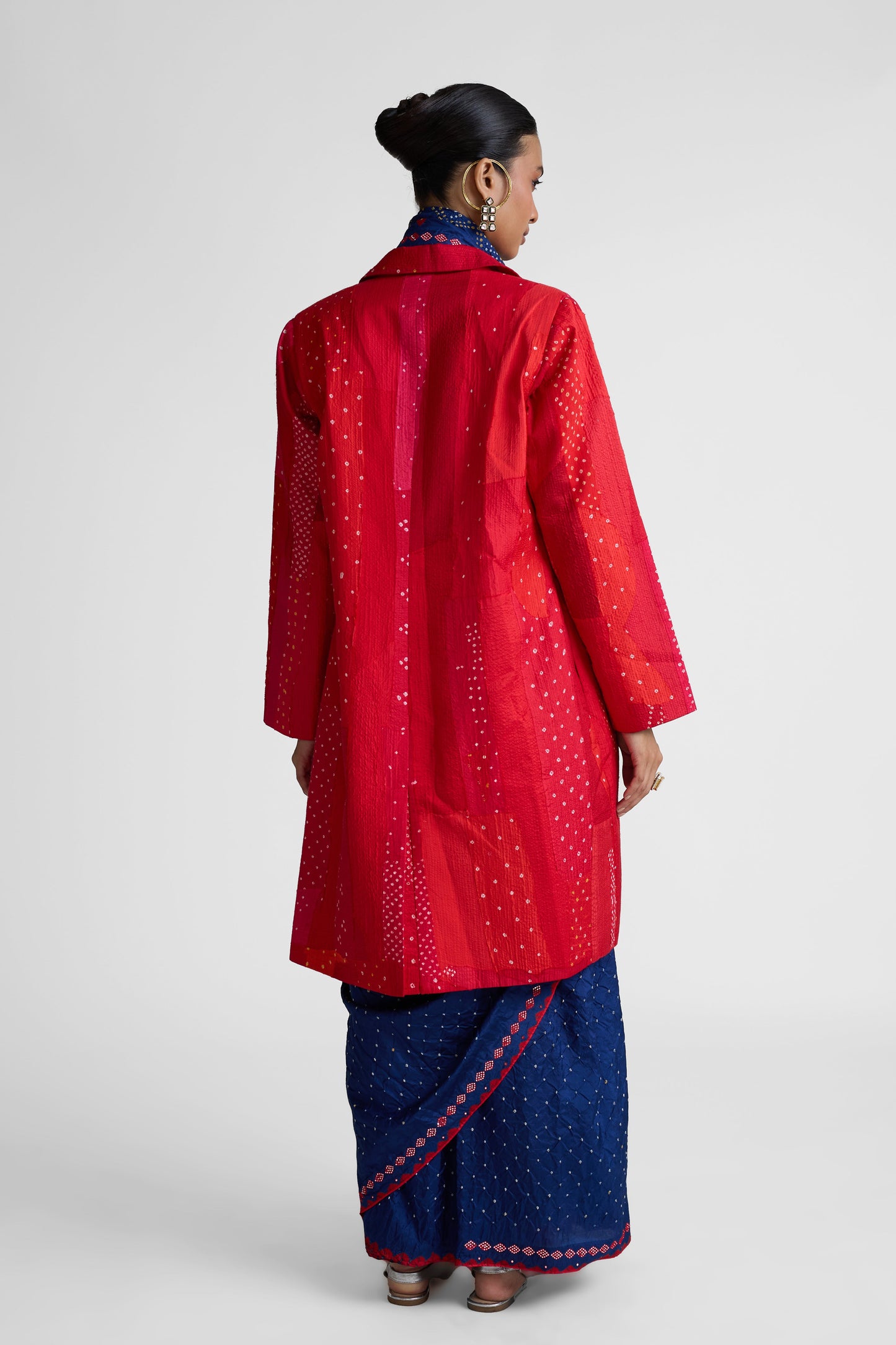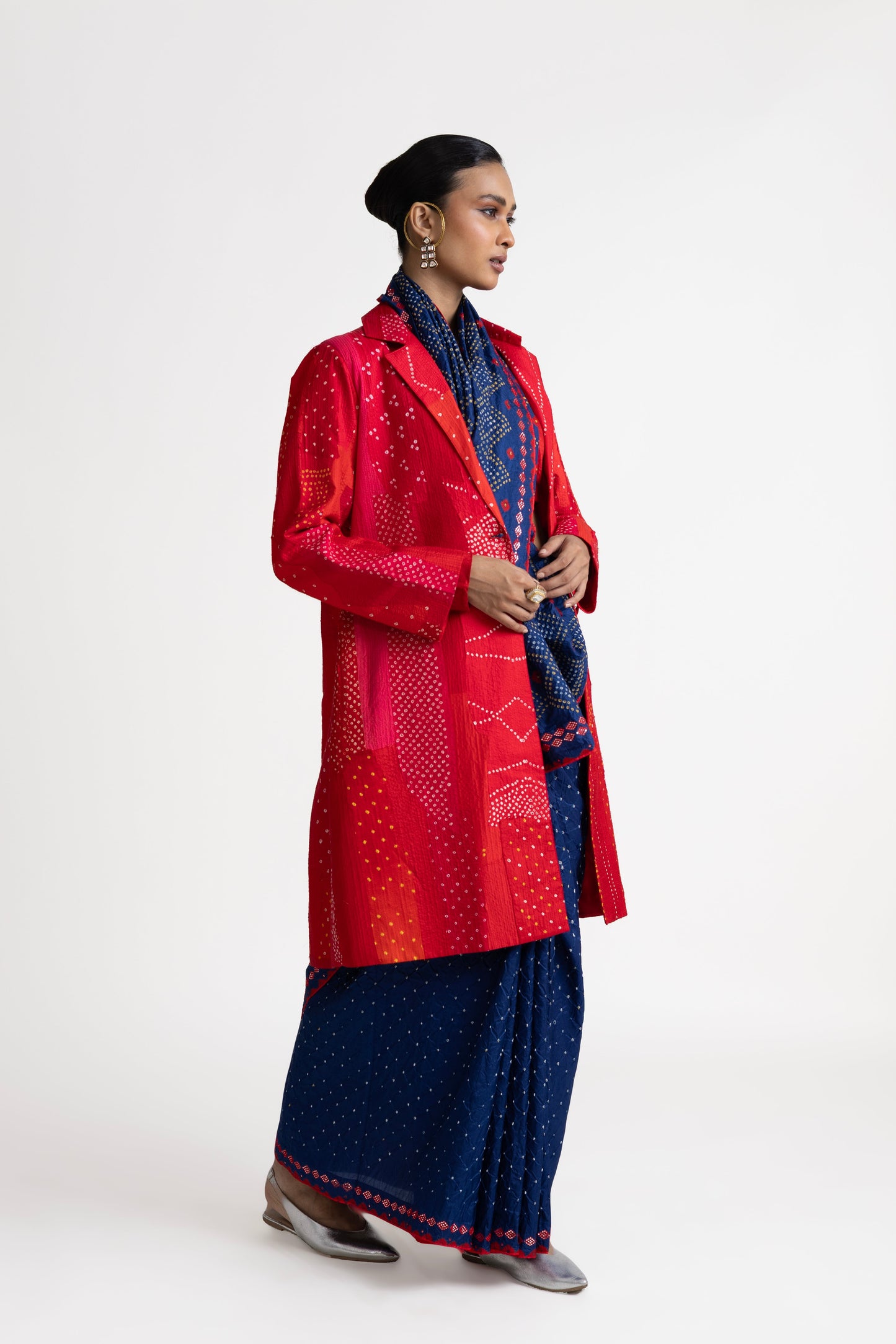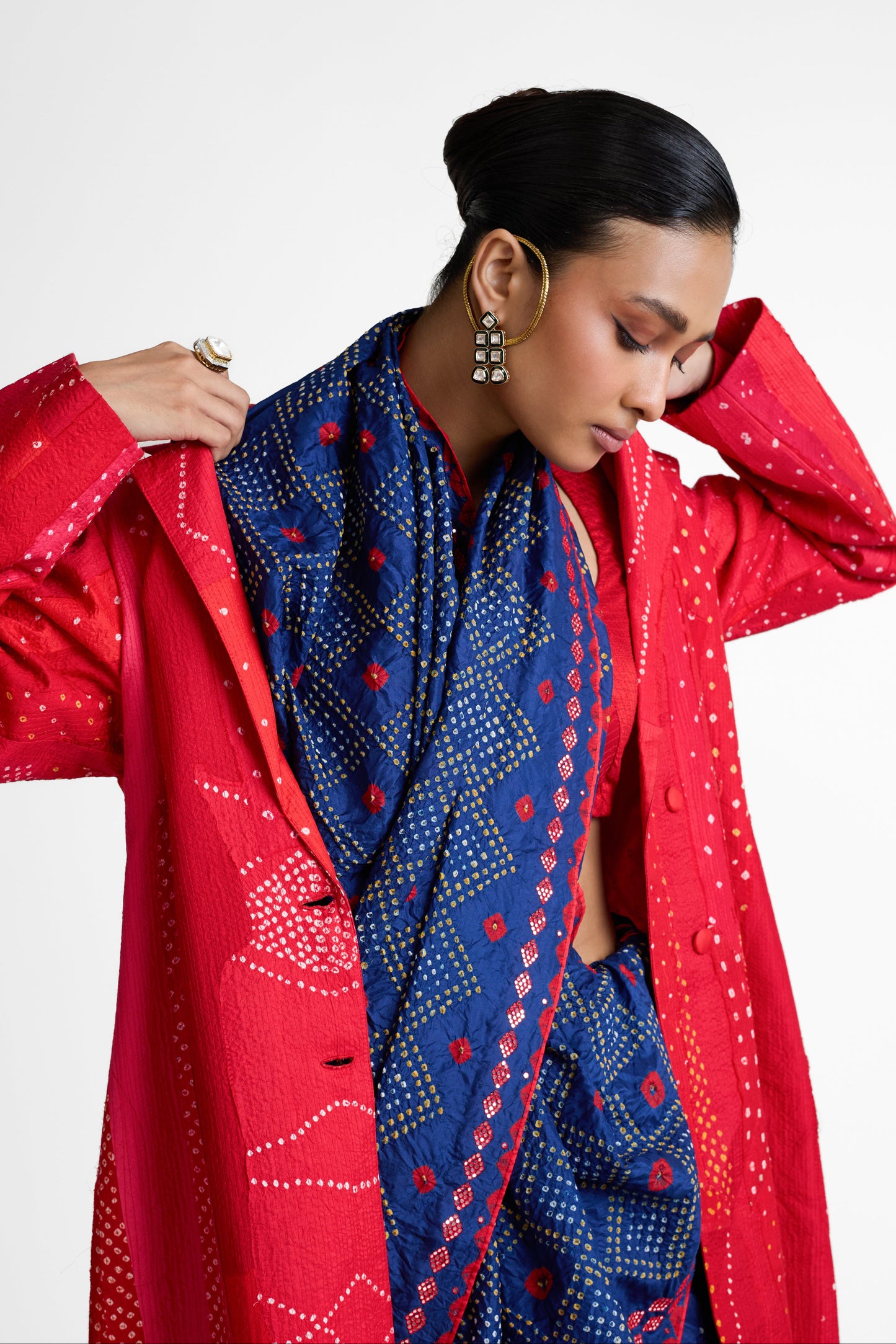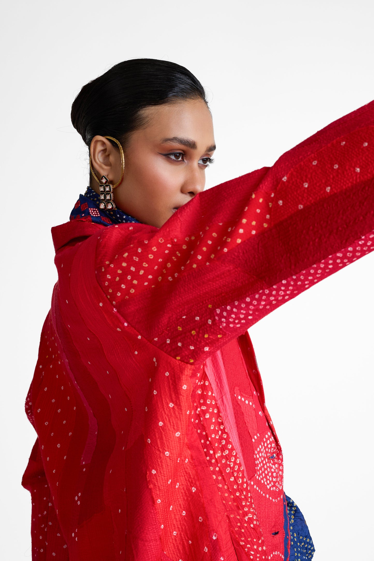 This is a patchwork Bandhani on silk long jacket, perfect to be clubbed with sarees as an outerwear. Alternatively, they can be styled with tailored trousers along with crop or tank tops.