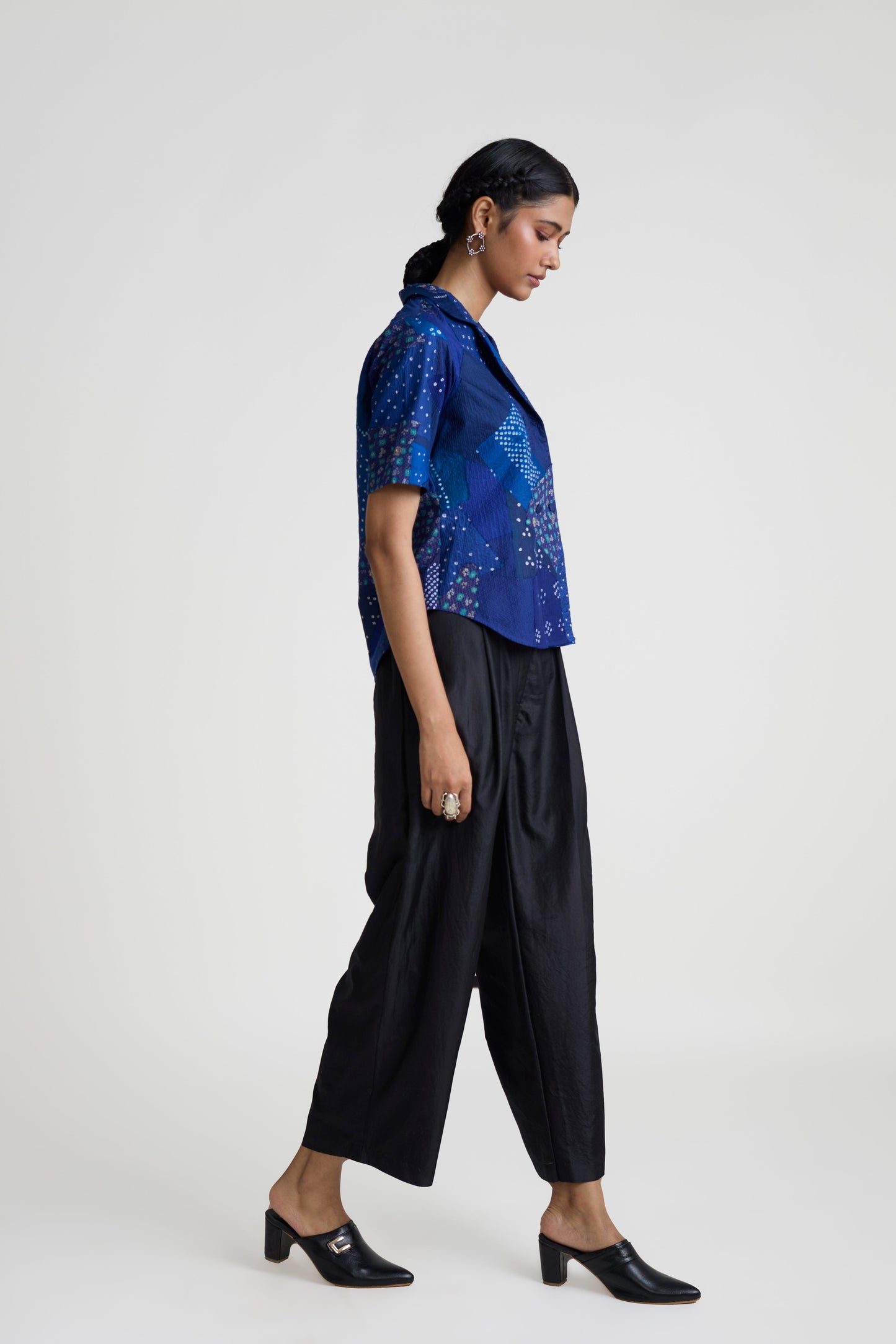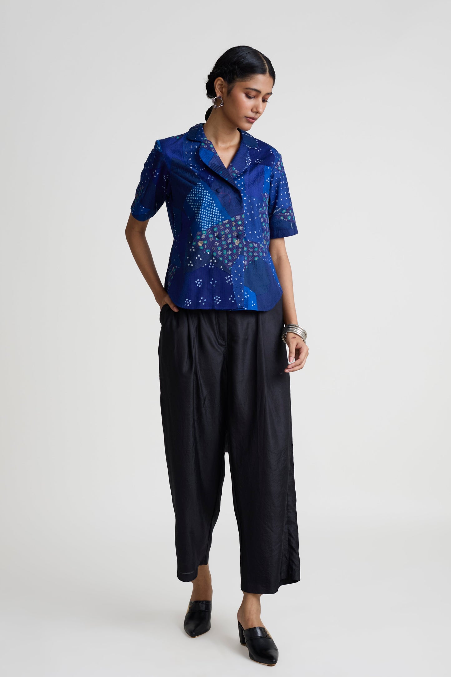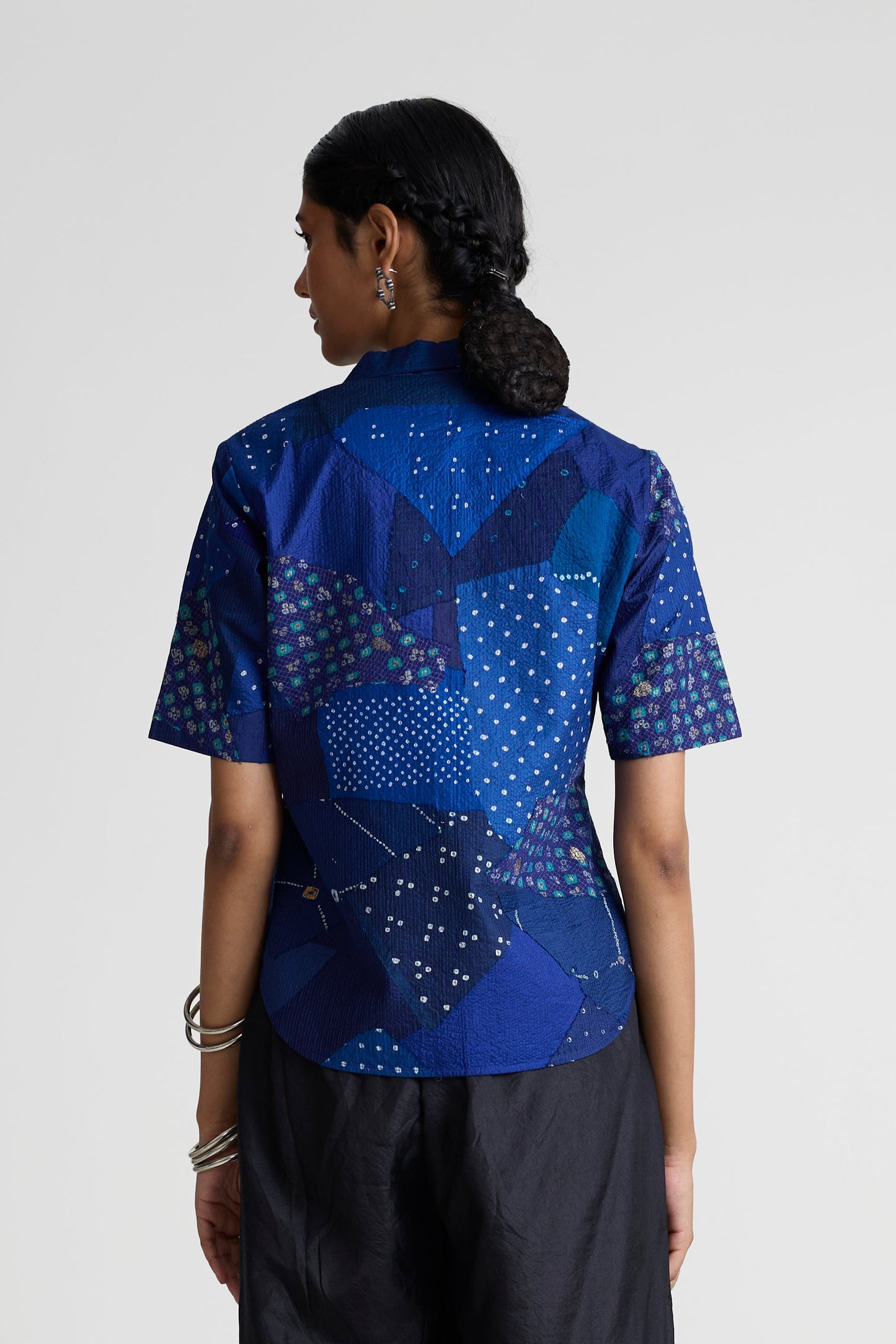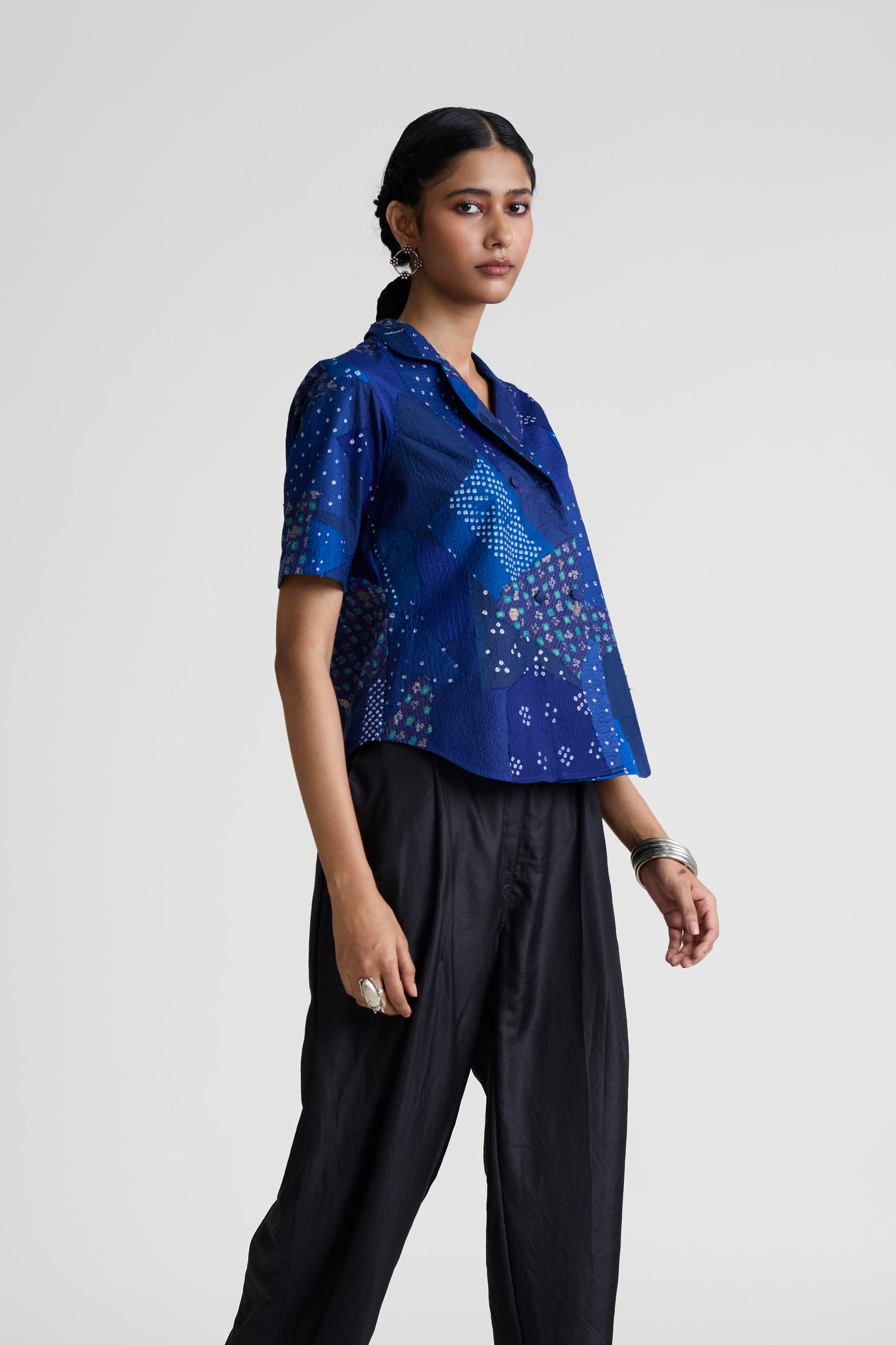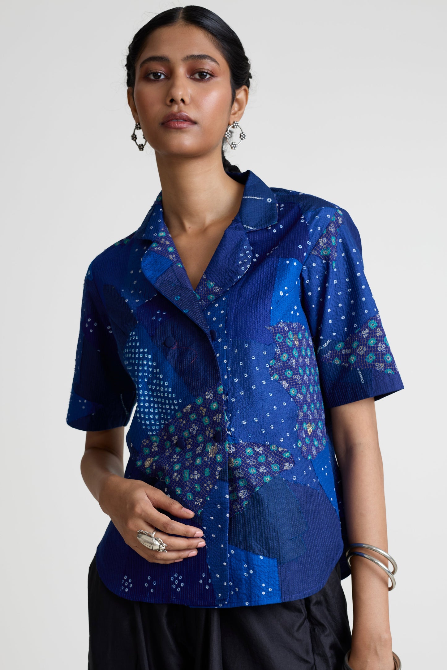 Please note that this shacket is made using patchwork Bandhani fabric. Hence, no two pieces are exactly the same due to the technique used. The final piece will be similar to the image, not same.