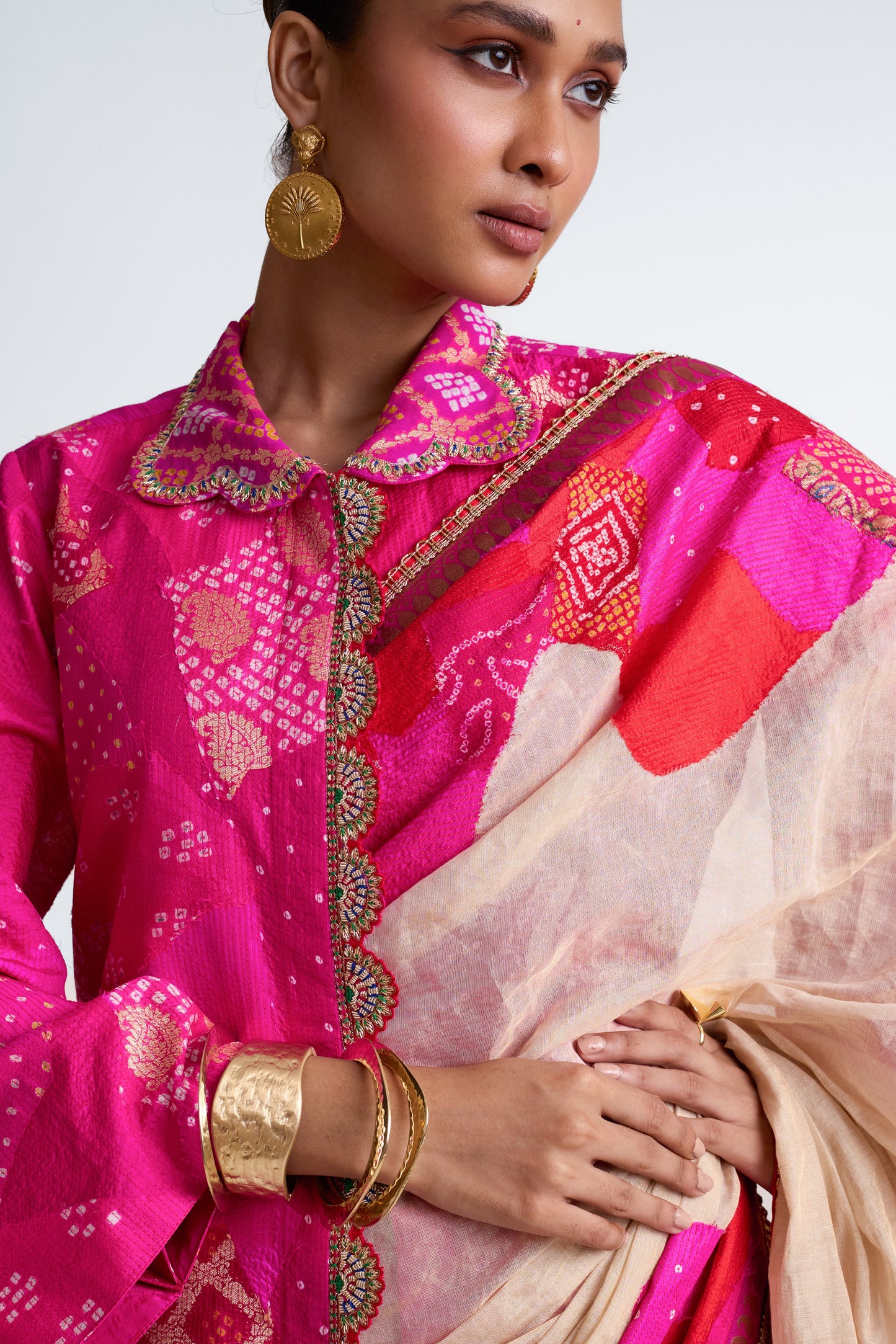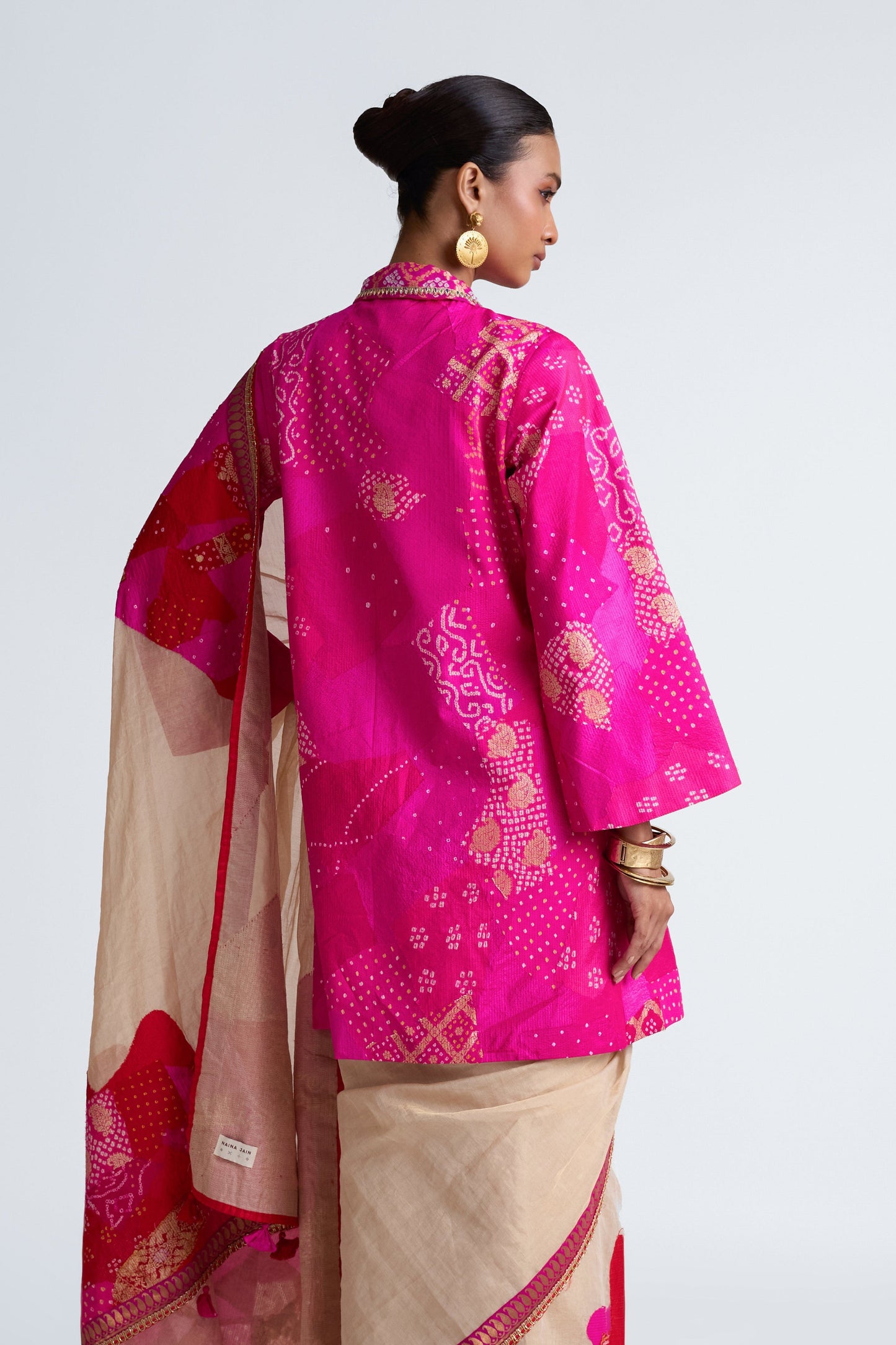 Please note that this jacket is made using patchwork Bandhani fabric. Hence, no two pieces are exactly the same due to the technique used. The final piece will be similar to the image, not same.
