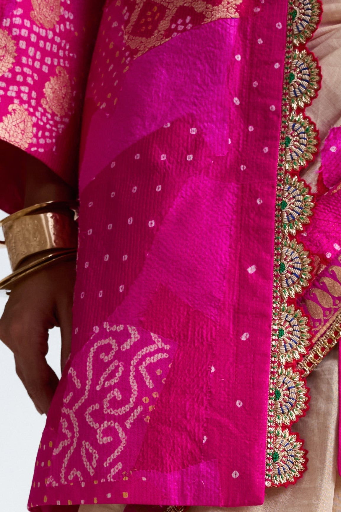 This is a Bandhani patchwork jacket with hand embroidered zardozi border. It features a scalloped collar and bell sleeves.