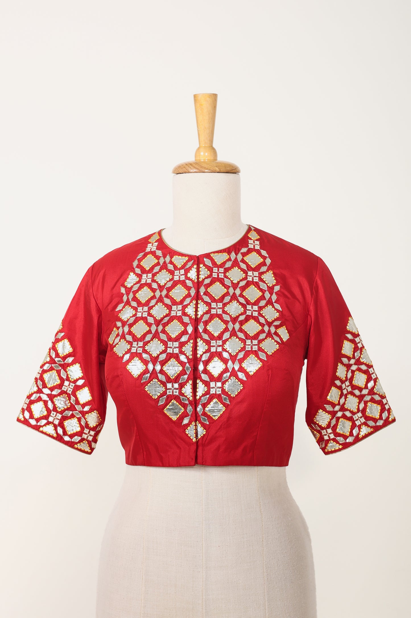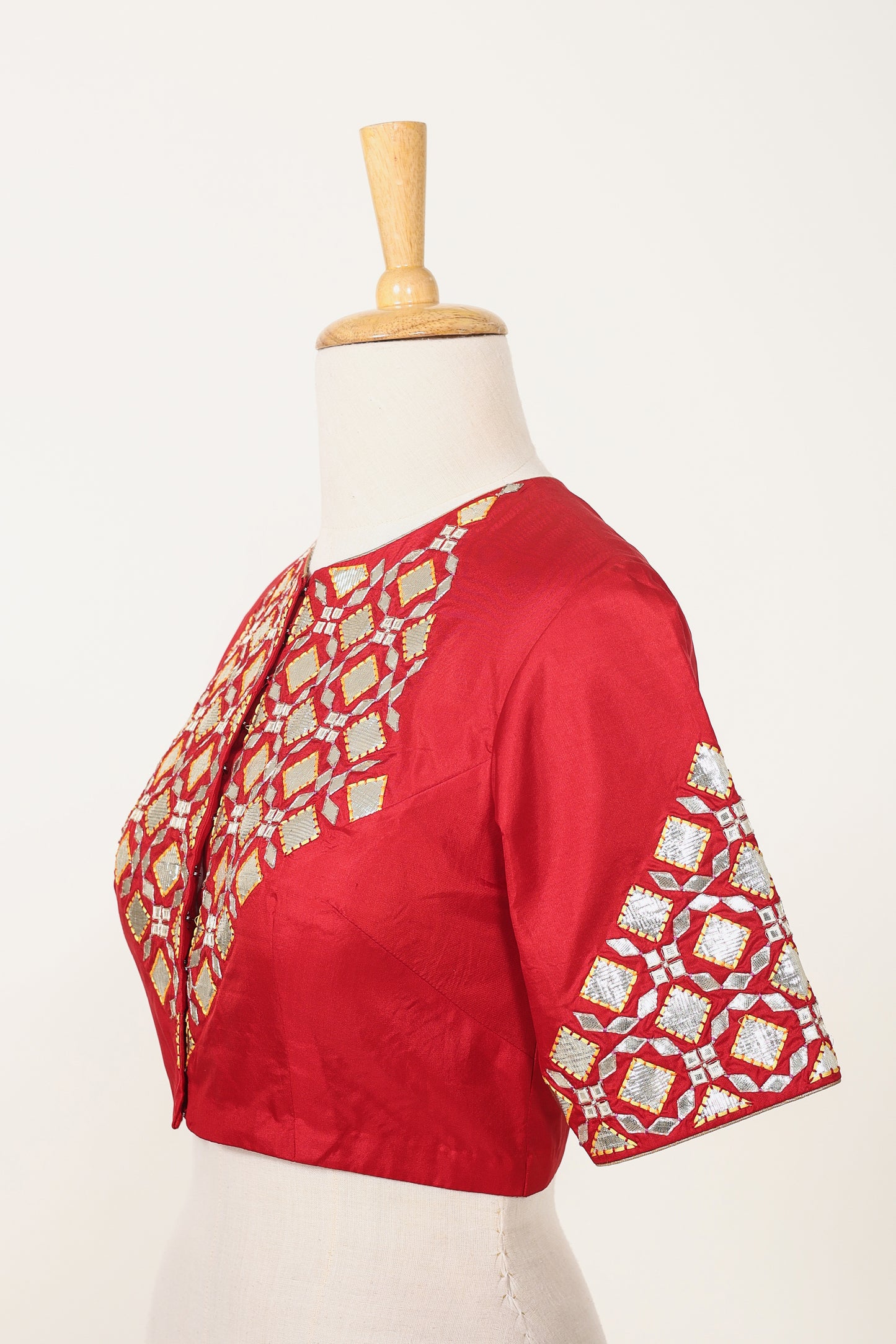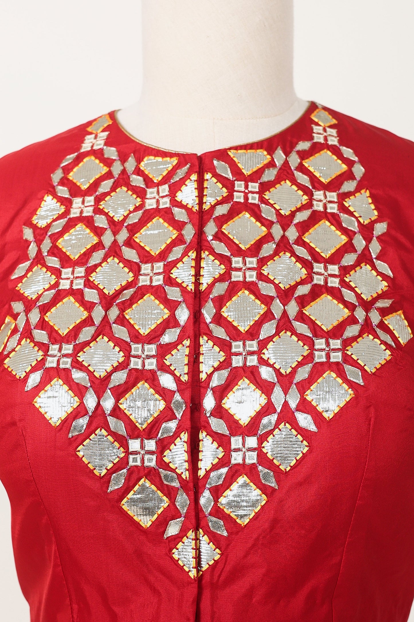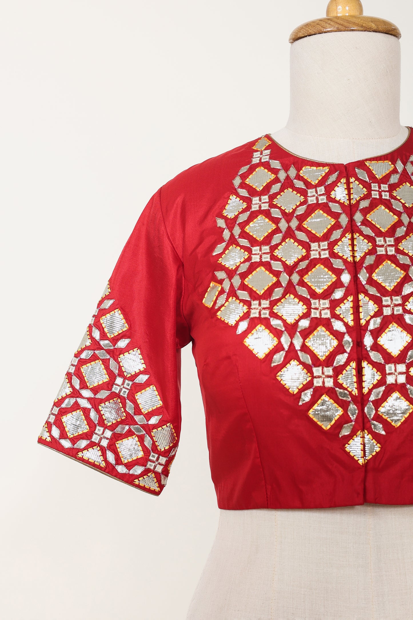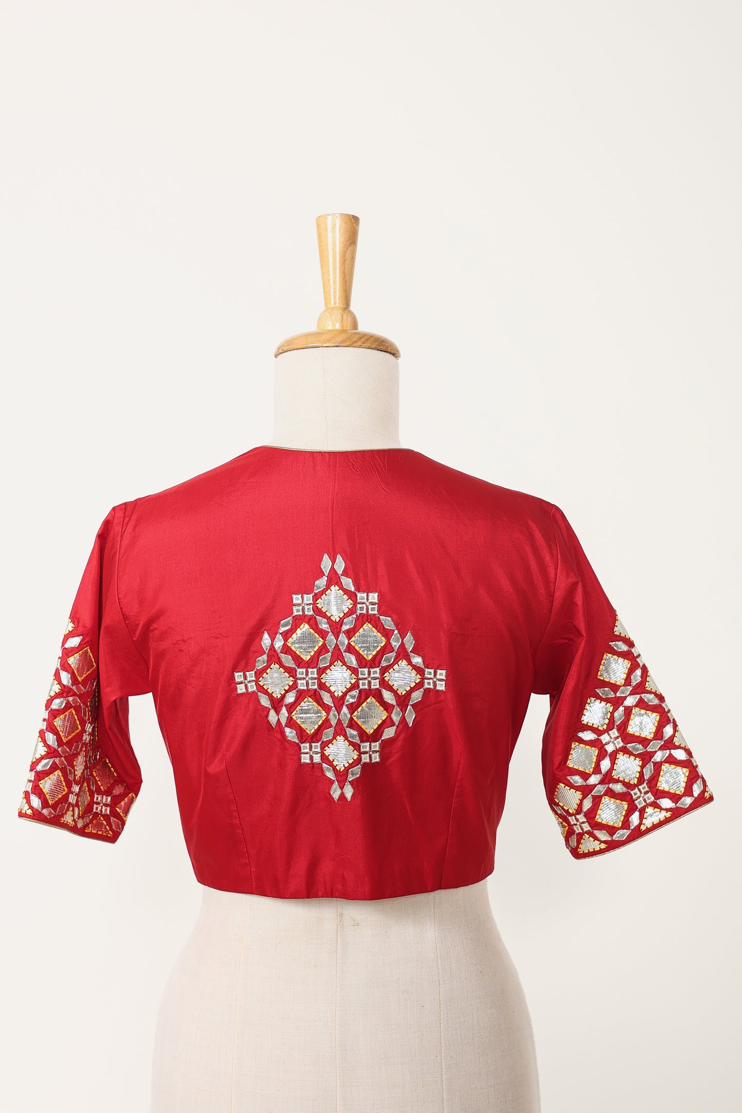 This is a red pure silk blouse that features a bold hand cut gota yoke. A small motif is featured on the sleeves and back. The embroidery placement is ornamentative that makes a statement; can be styled with Bandhani, Banarasi and Kanjeevaram sarees or even lehengas. The blouse has a front button closure.