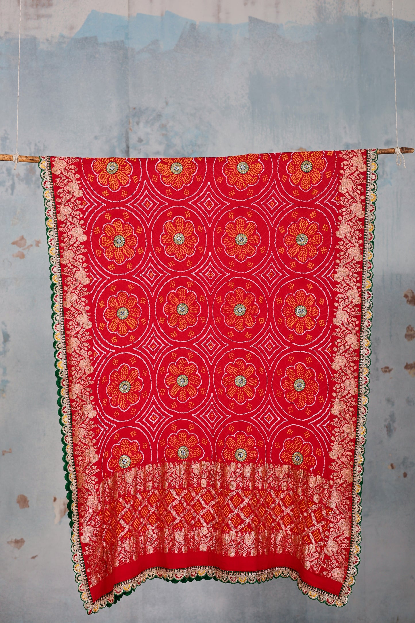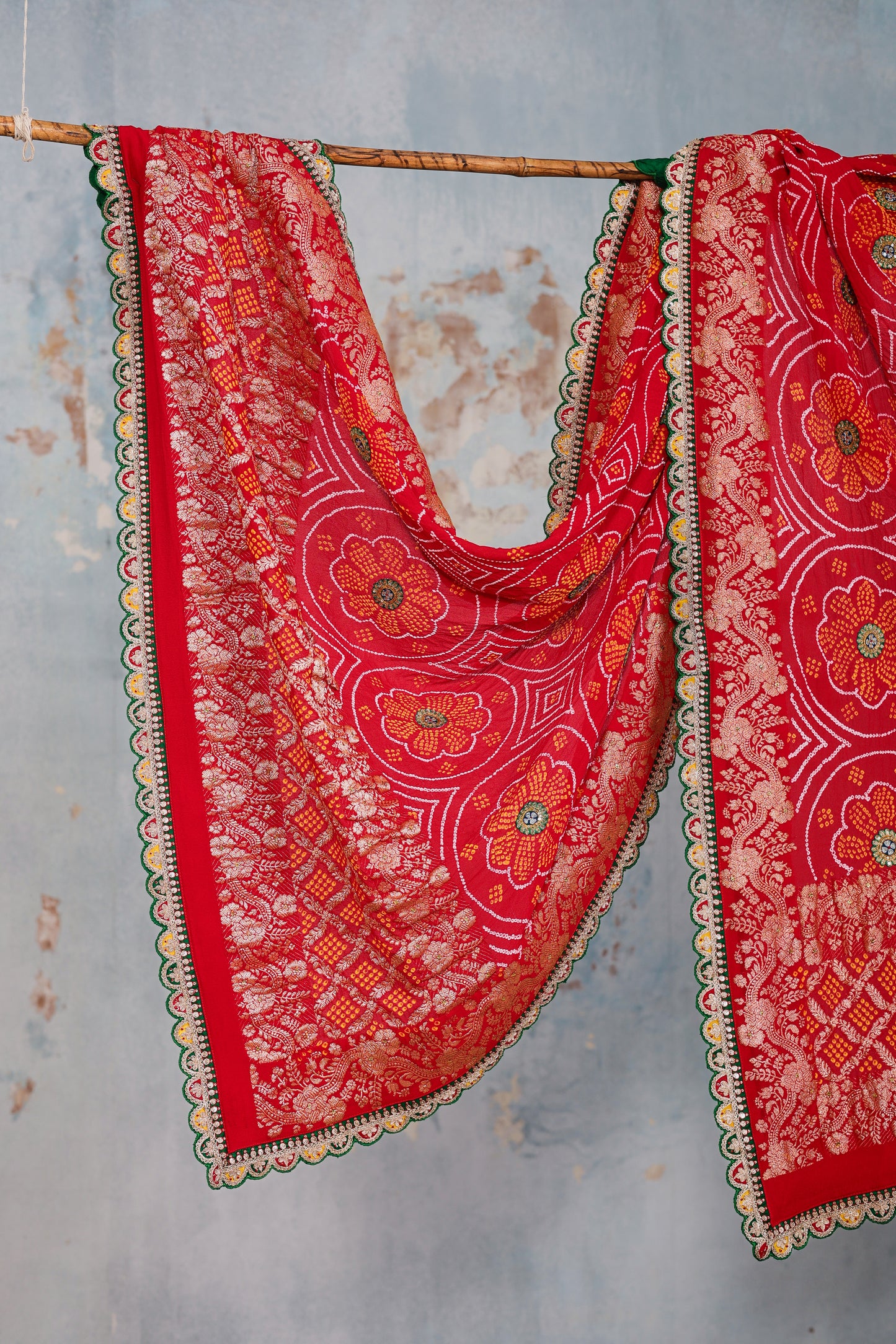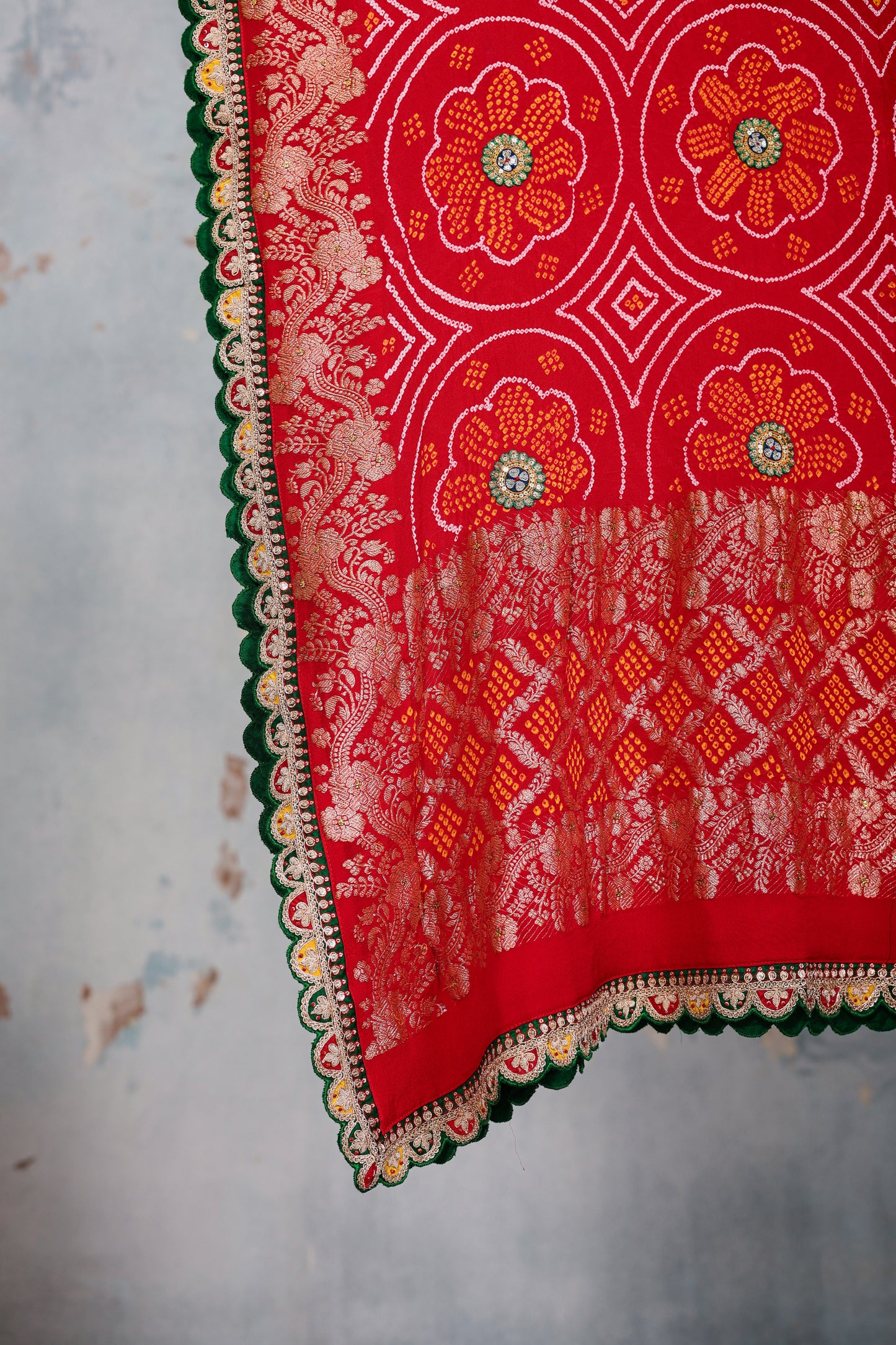 This is a red Banarasi Bandhani dupatta on pure georgette. The circular floral pattern of Bandhani is highlighted with hand embroidered zardozi bootis on a contrast green patch. The edges come lined with a hand embroidered scalloped zardozi border on contrast coloursful patches. This dupatta is 2.5 metres in length.