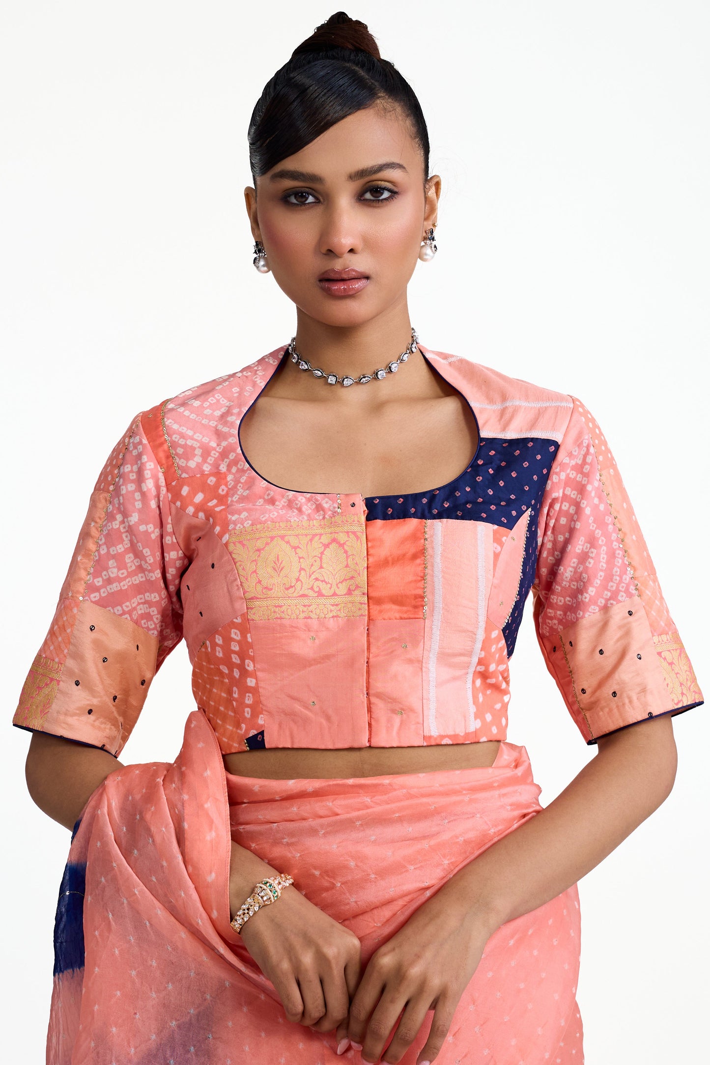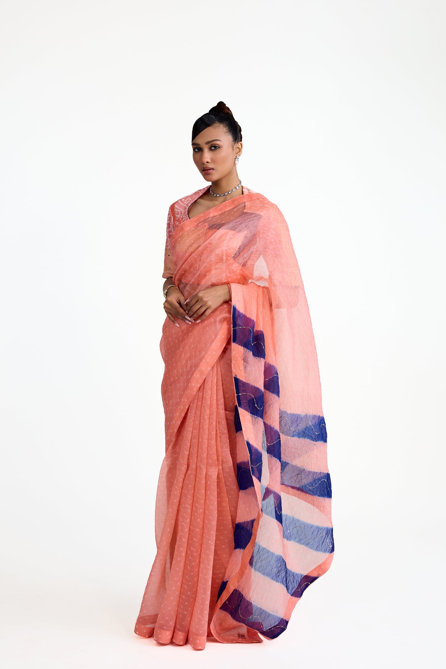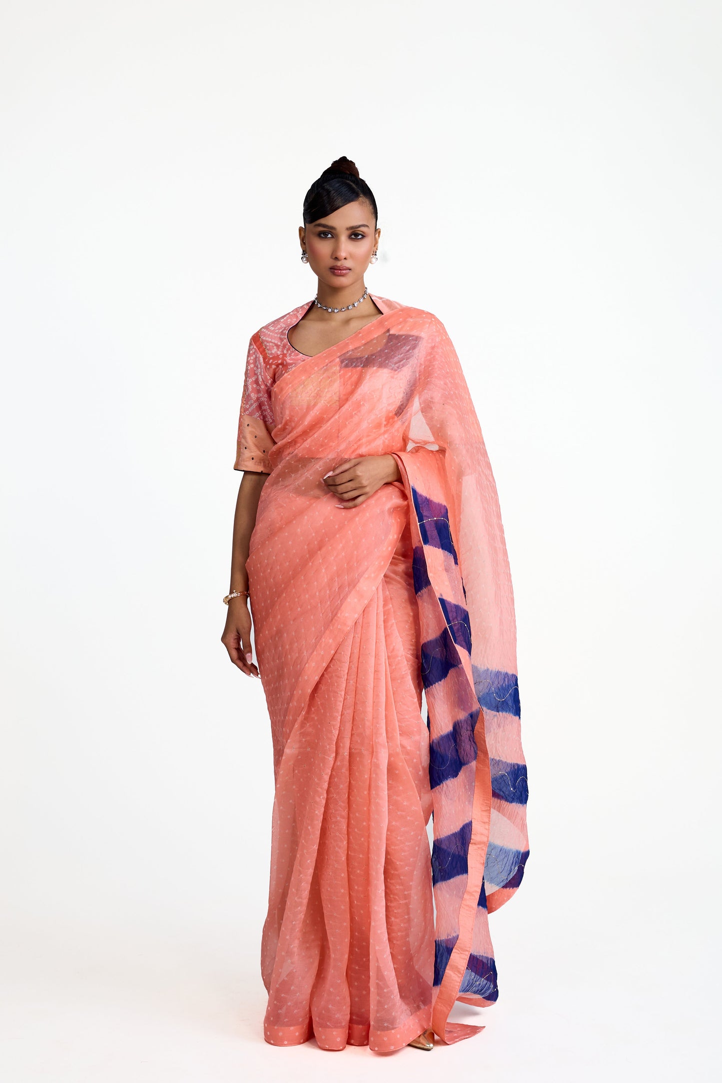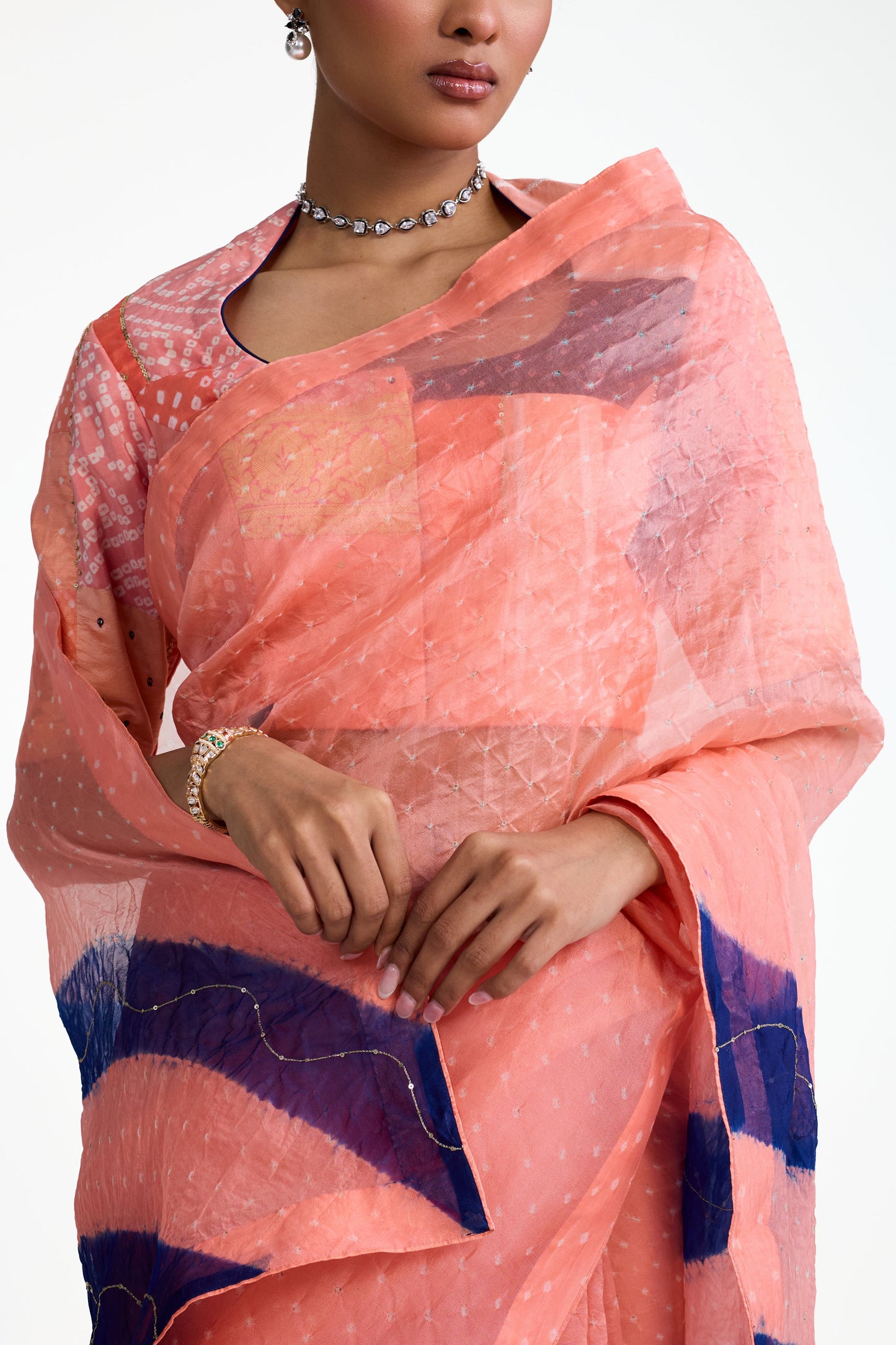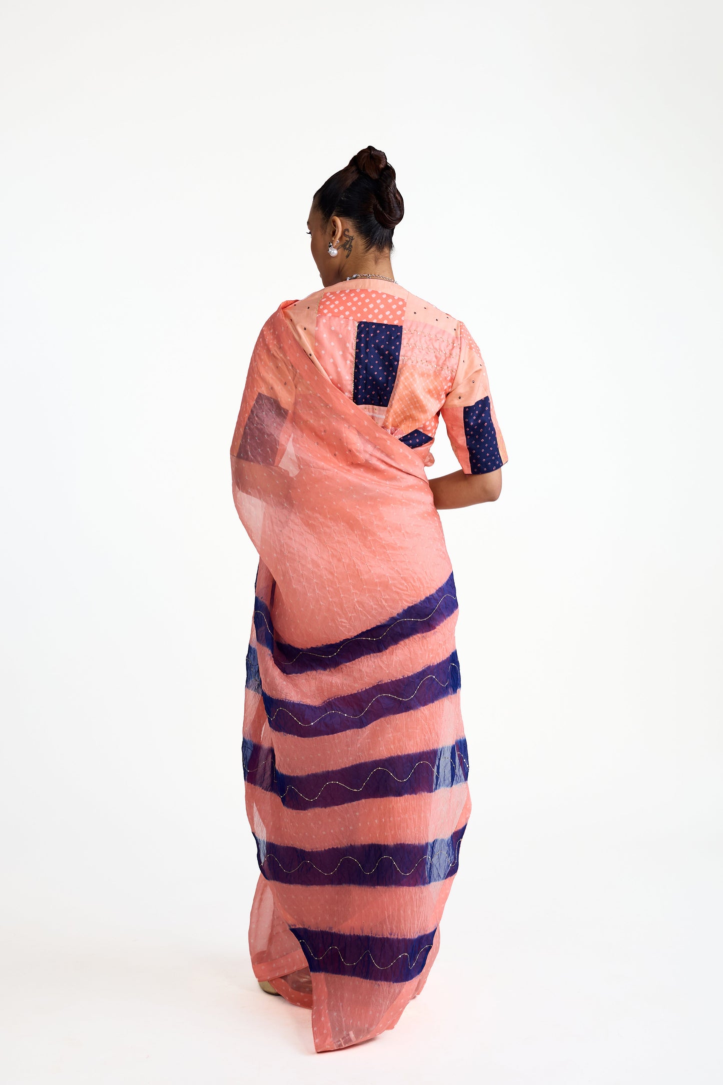 This is a peach Bandhani on organza saree whose palla features a striking diagonally striped pattern in navy blue. The highlight of this saree is its unique blouse that is made using one of a kind Bandhani patchwork, in tones of peach and blue.