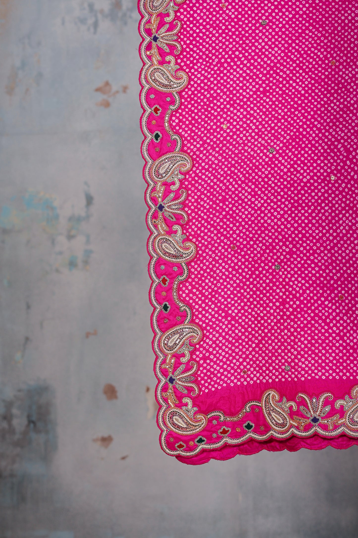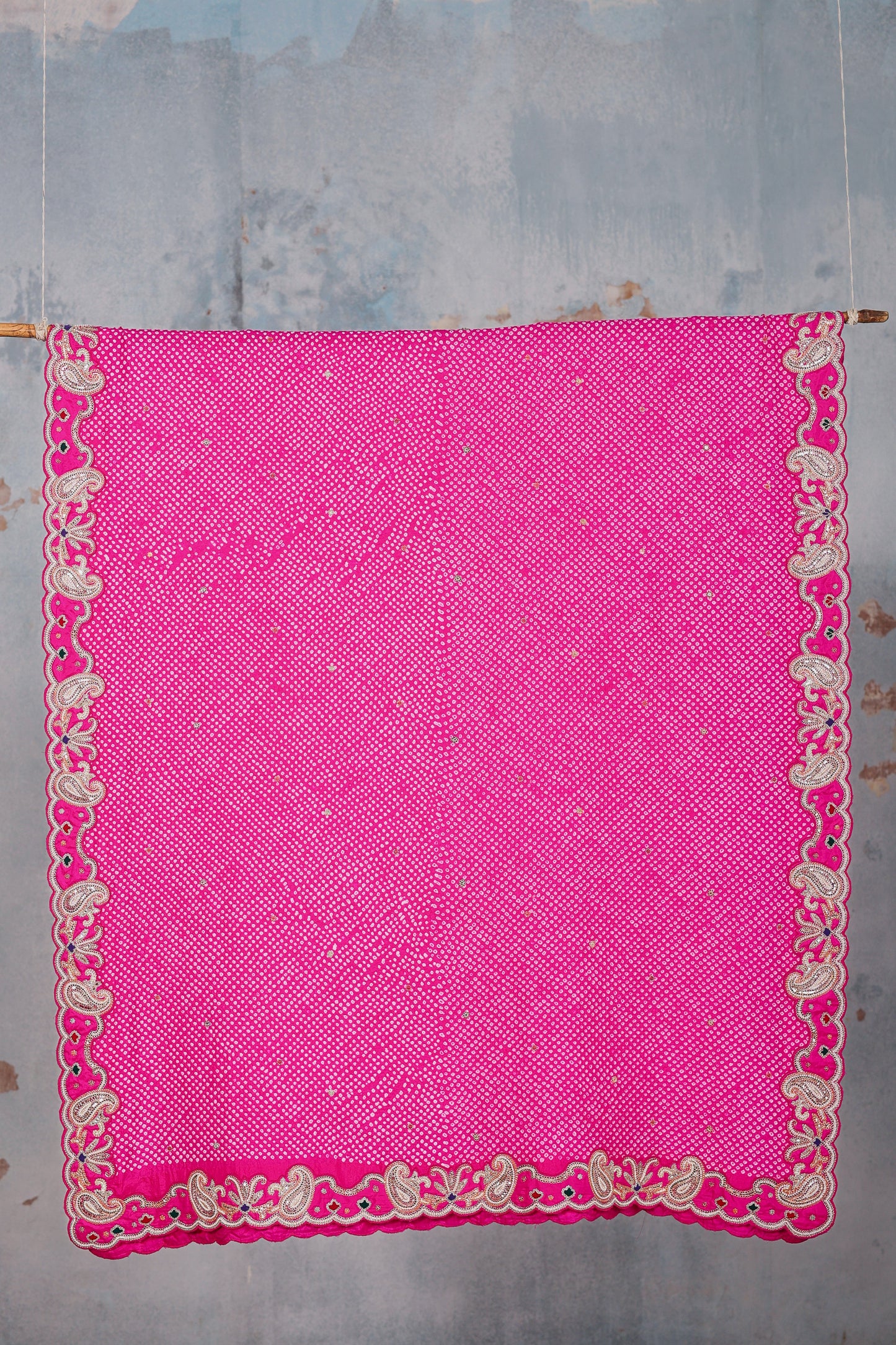 This is Bandhani on pure silk dupatta in Rani. Intricate white Bandhani dots forms a seamless pattern. The edges of the dupatta comes lined with hand embroidered paisley border made using french knot, moti and mukaish. bandhani is intricate in a repetitive pattern all over the dupatta. This dupatta is 2.5 metres in length.