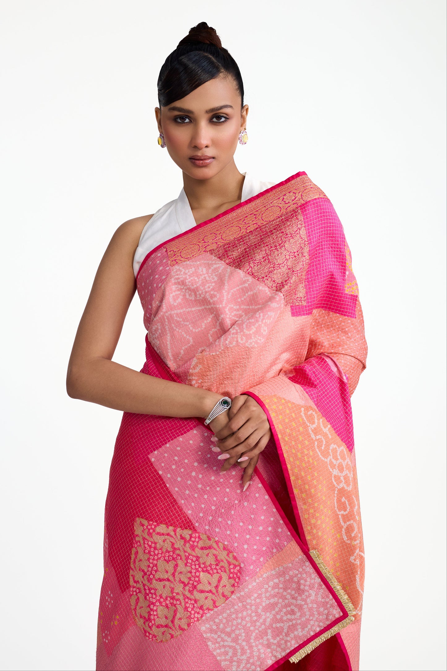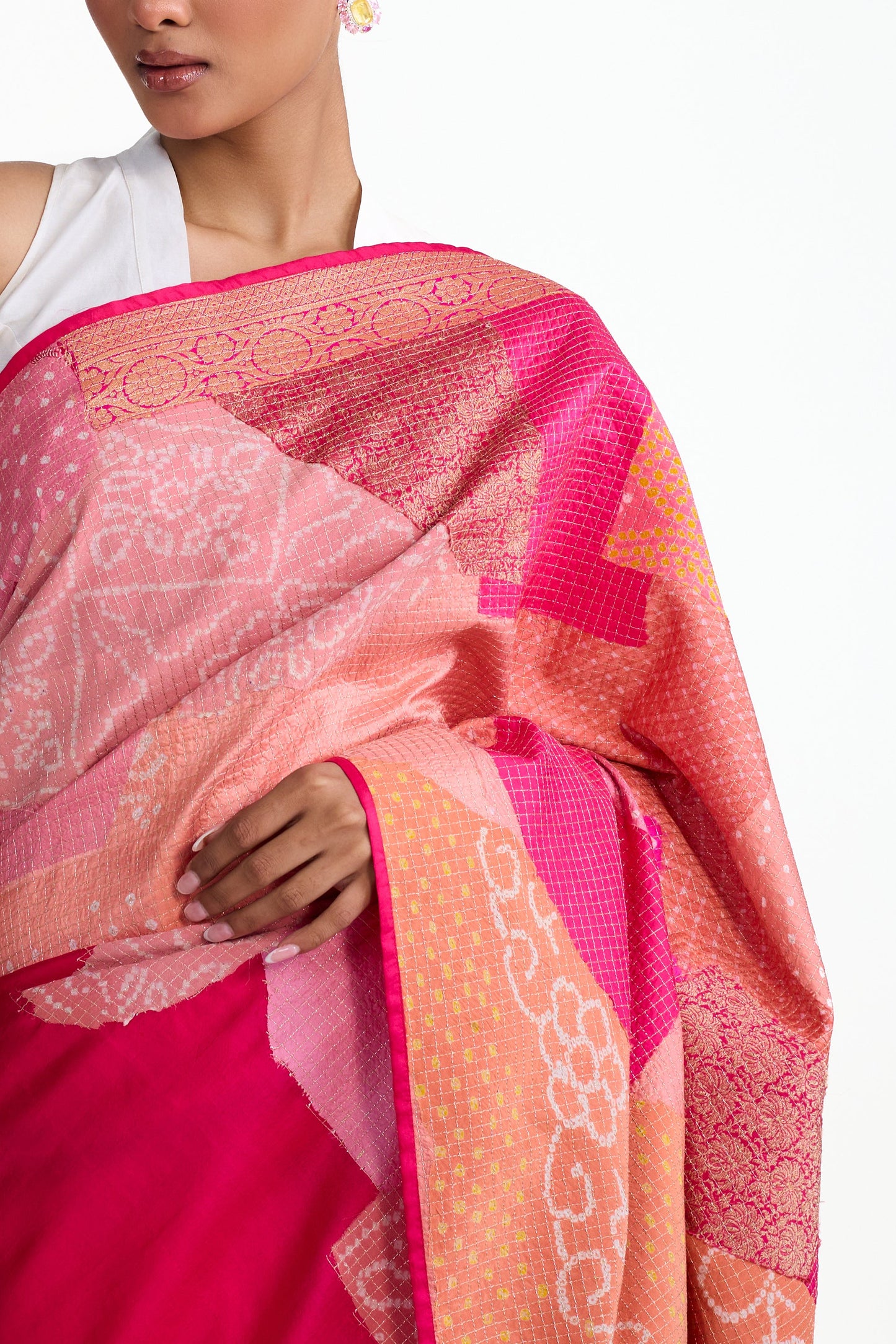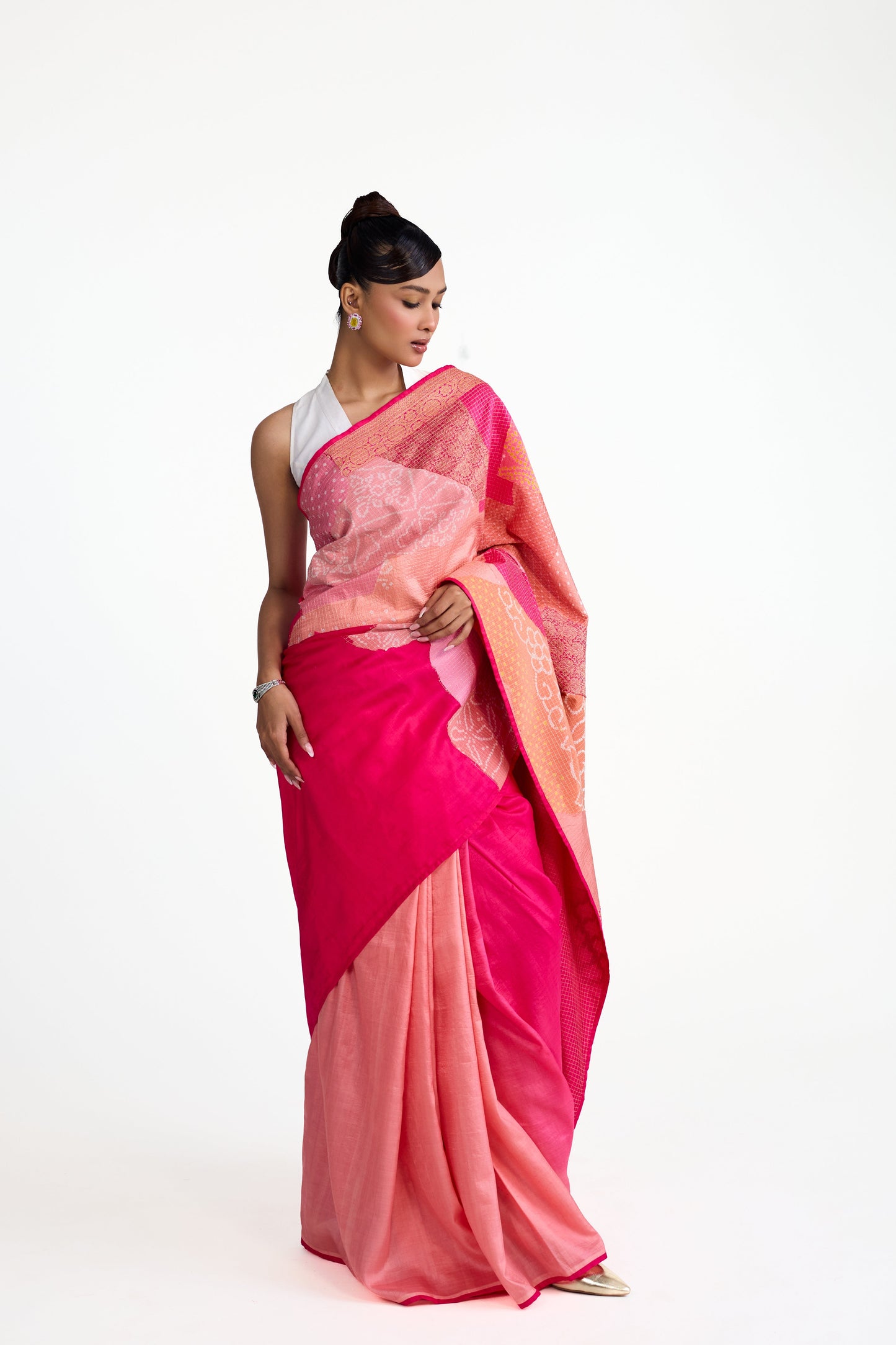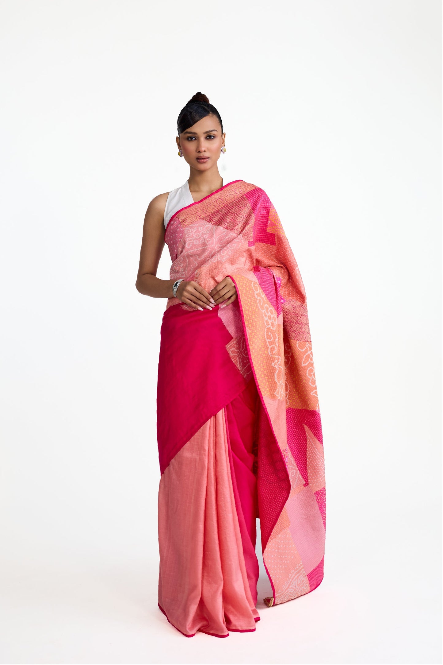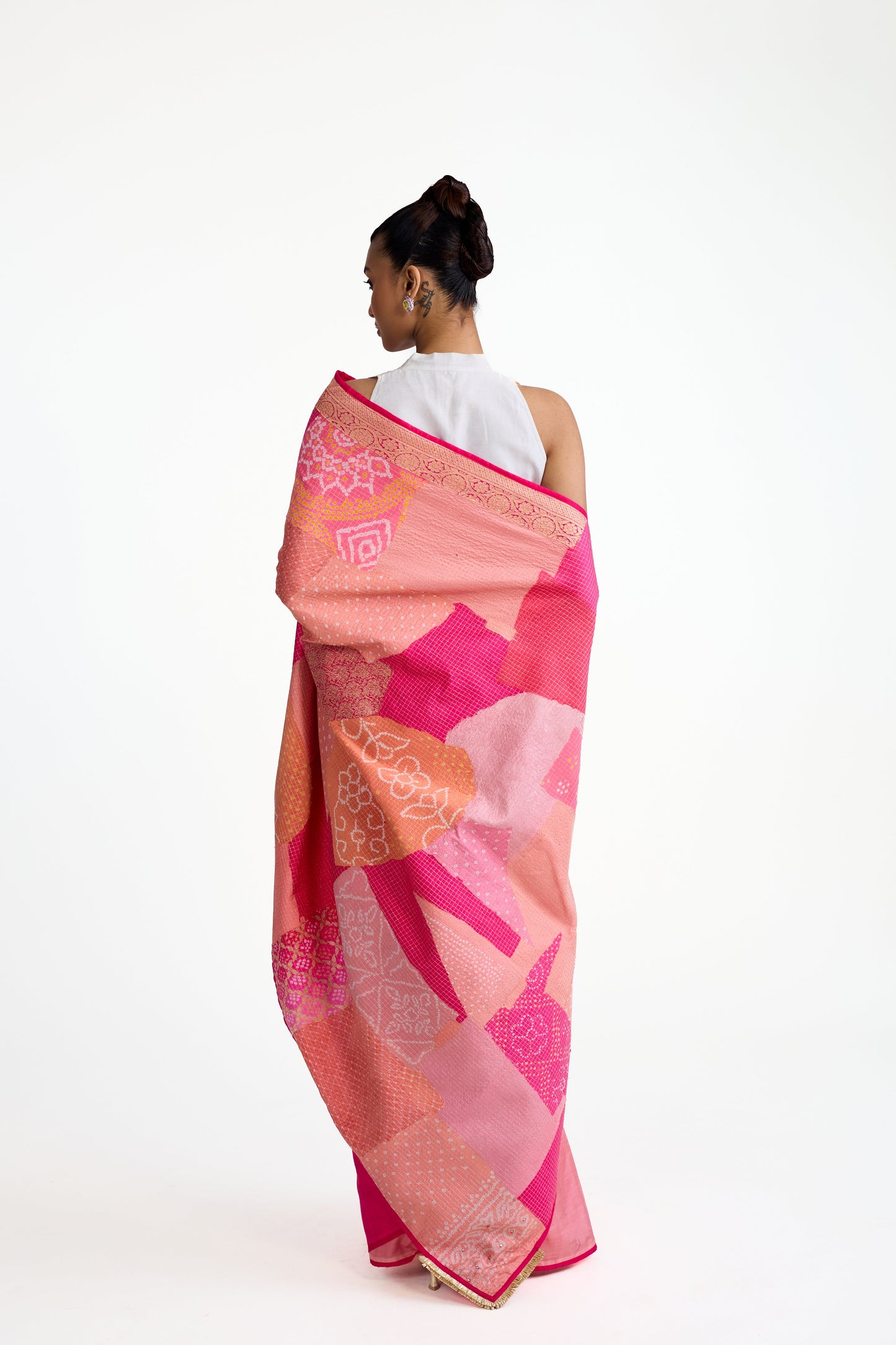 This is a Bandhani patchwork saree in pure silk that has a unique palla made by using organic shapes of Bandhani patches put together using the quilting method.. The pleats of the saree is shaded in peach and tomato pink. The saree comes with a Bandhani on silk blouse piece in tomato pink. The palla corners features gota fringes.